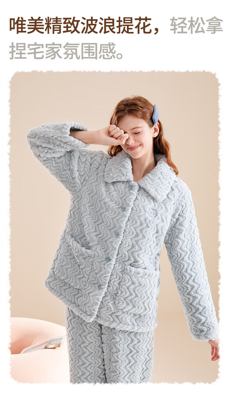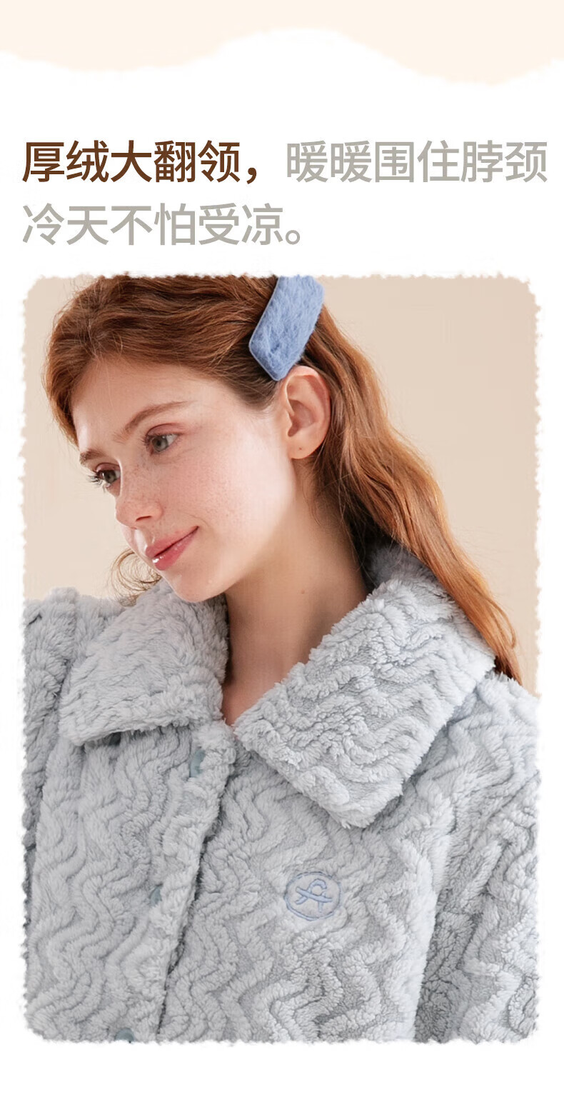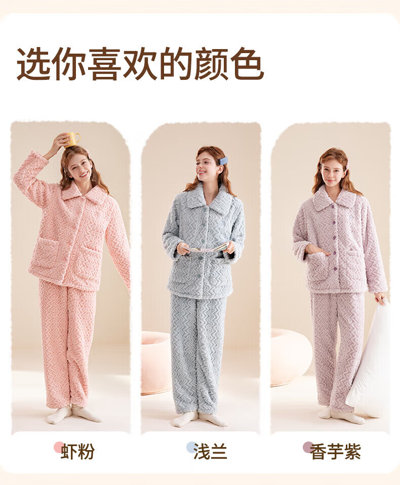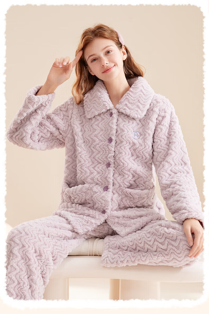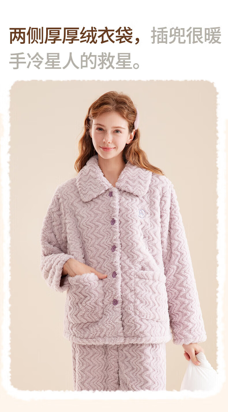 芬腾睡衣女【加厚暖绒】秋冬季少女感保暖翻领开衫长袖家居服套装 香芋紫 L