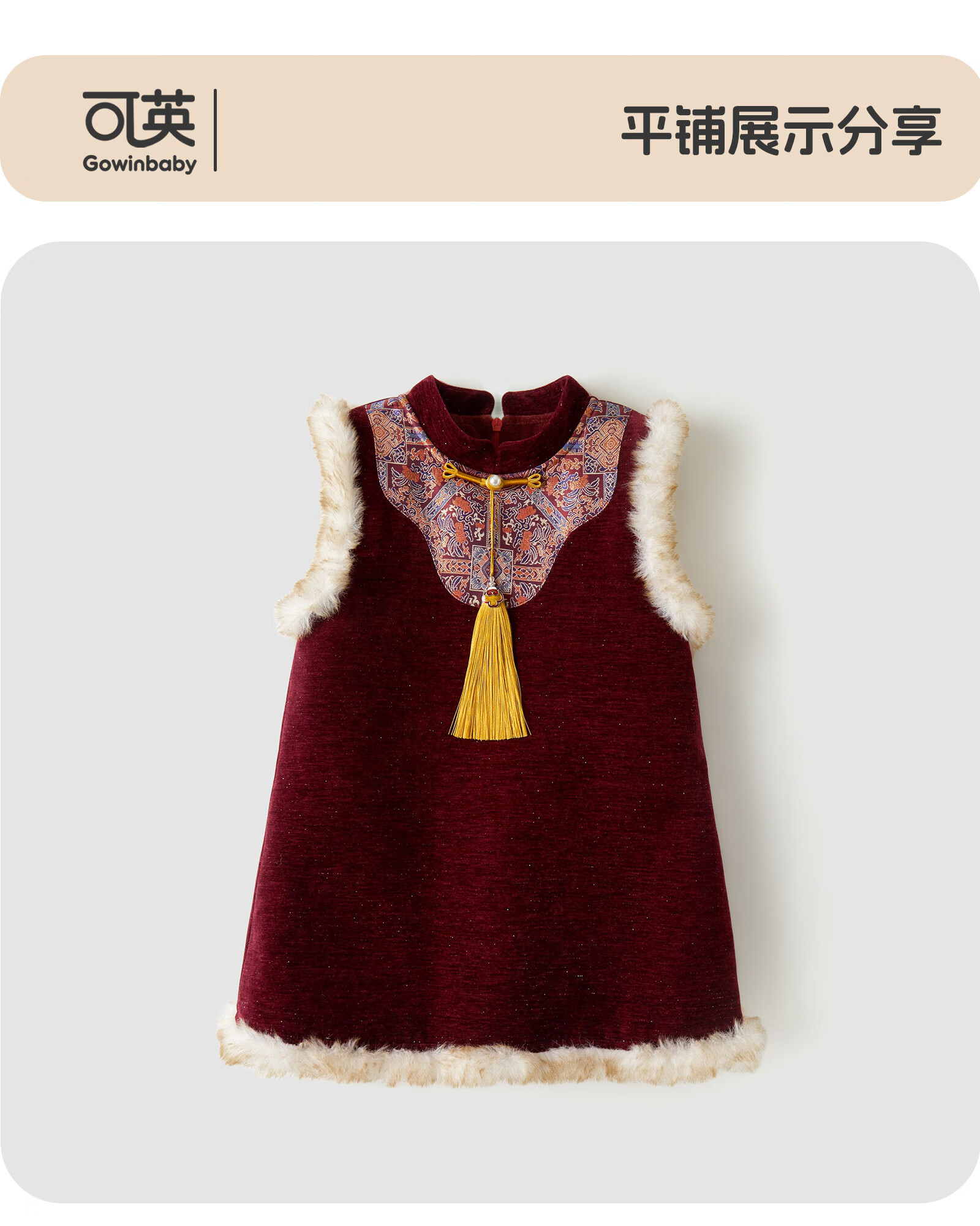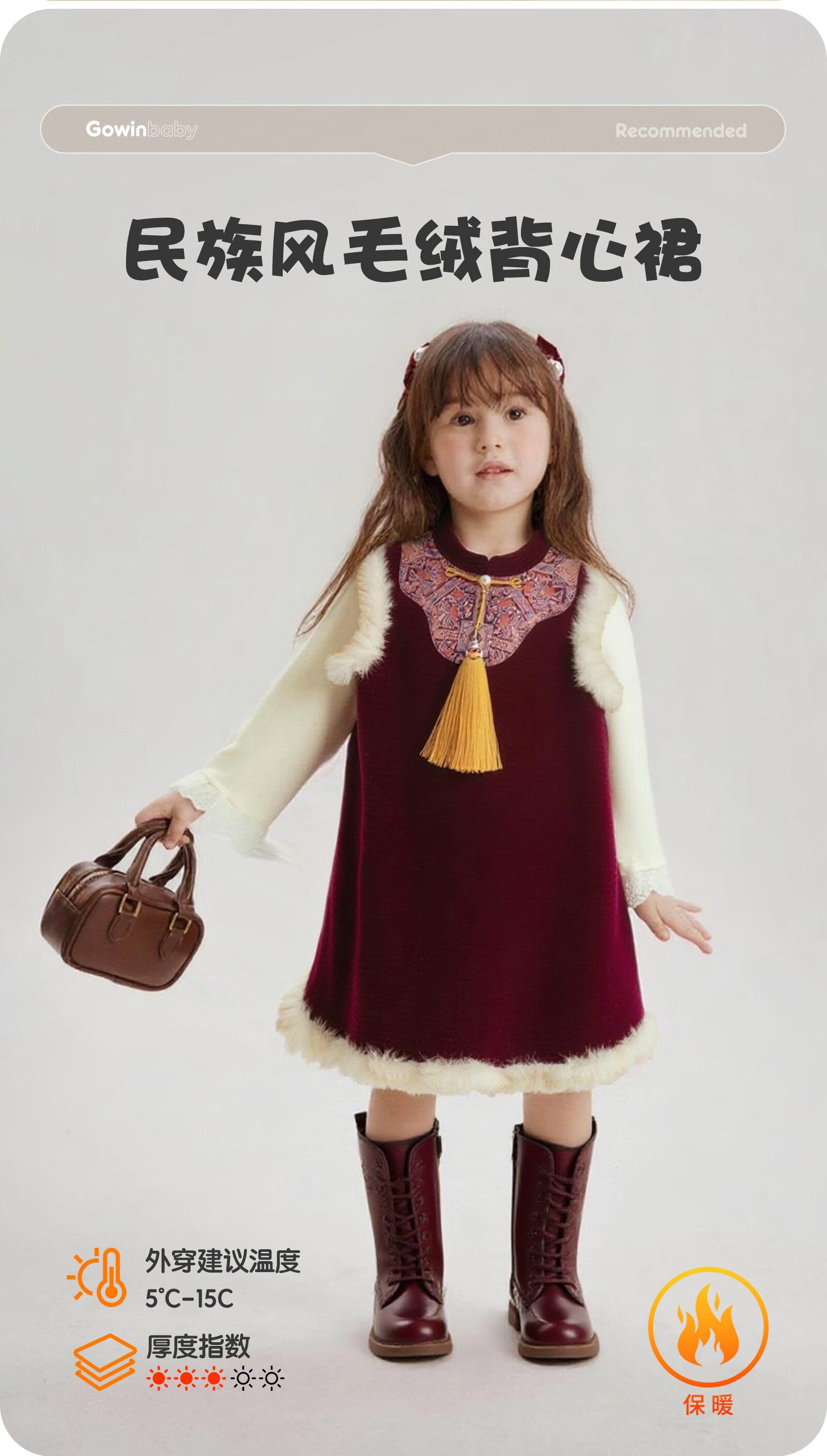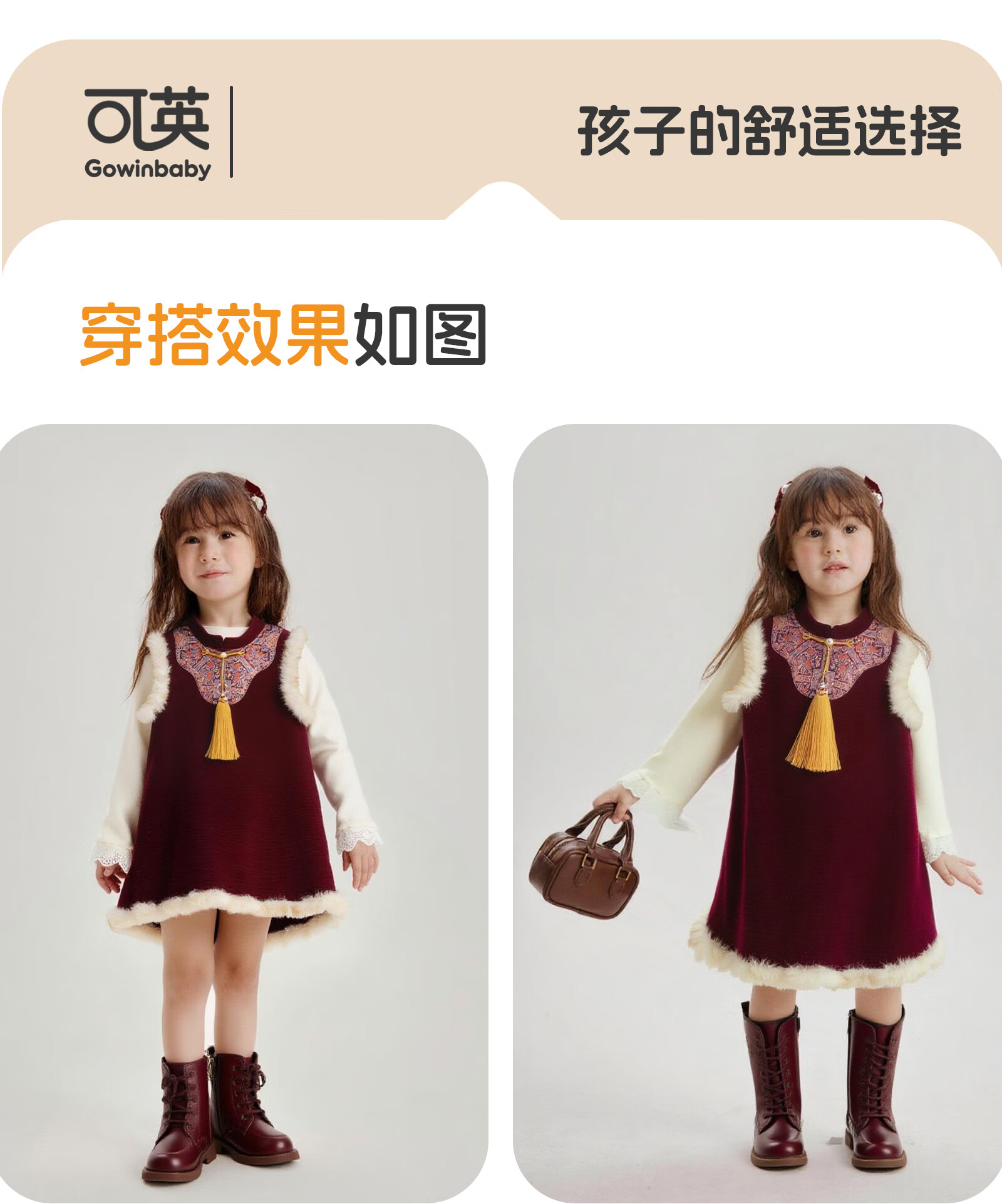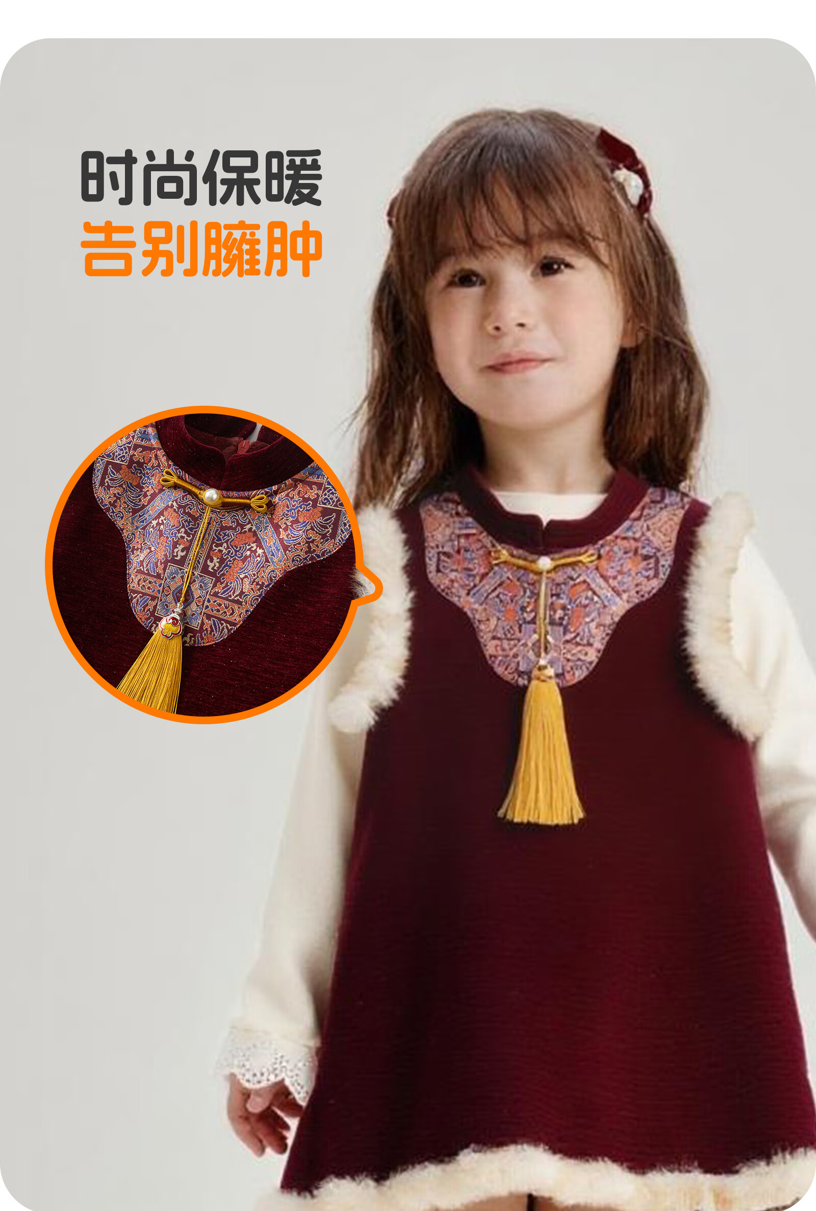可英女童连衣裙民族风保暖2025秋冬女宝甜美公主裙女孩红色加绒背心裙 酒红色 110 (适合身高100cm-110cm)