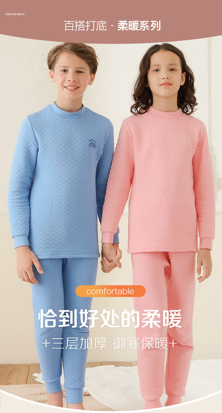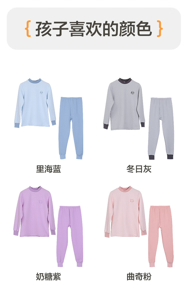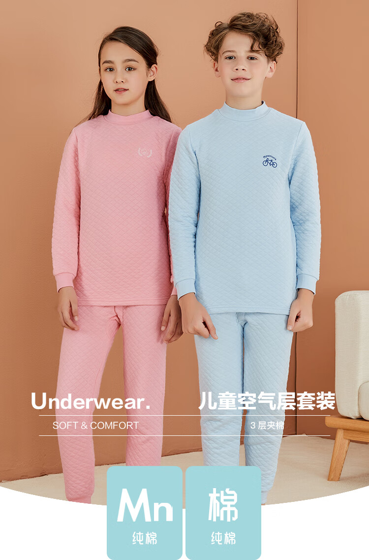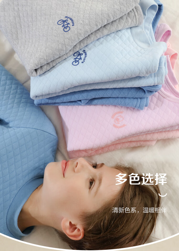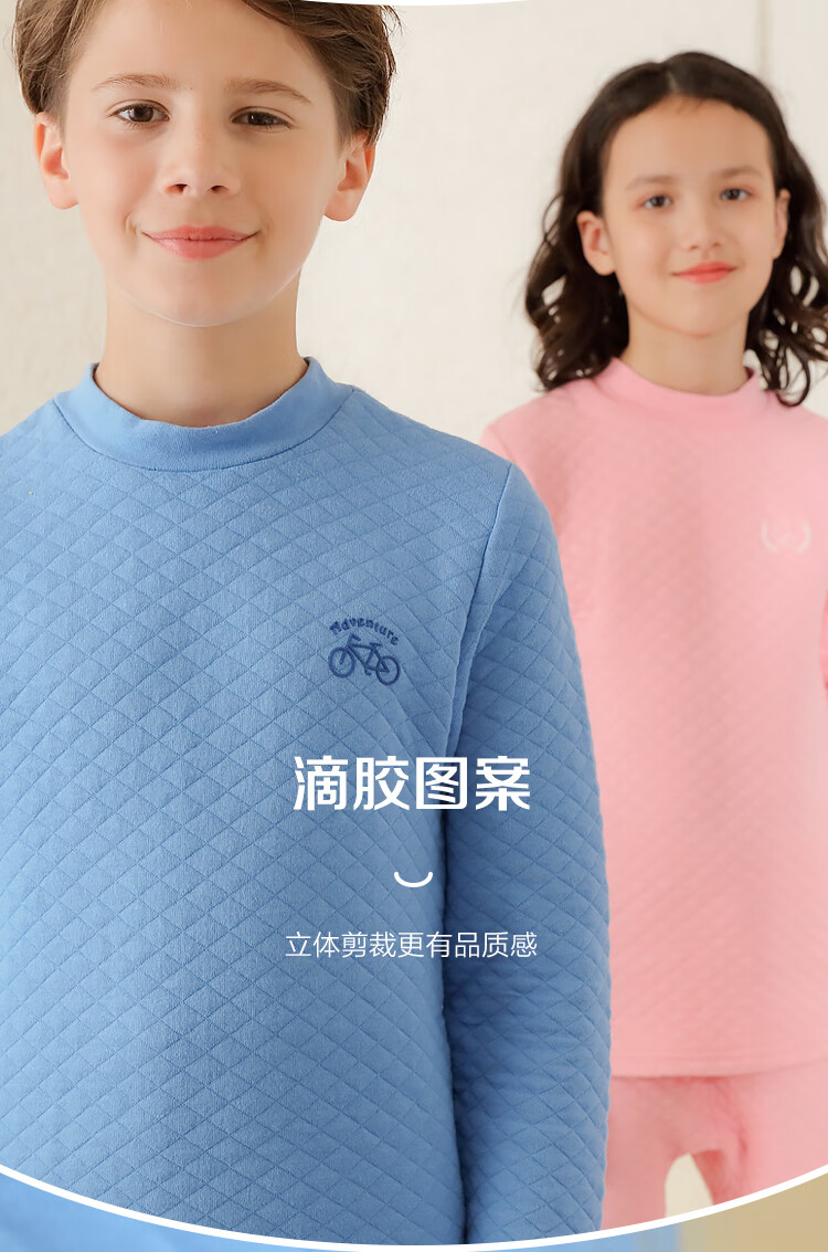 红豆居家(Hodohome)儿童保暖内衣男童半高领纯棉三层夹棉加厚空气层秋衣秋裤205蓝140