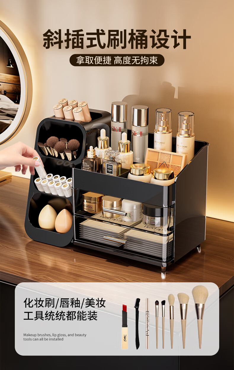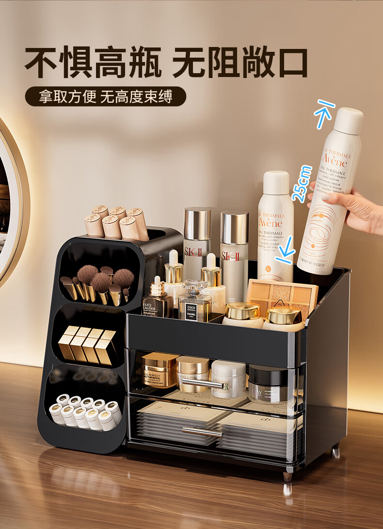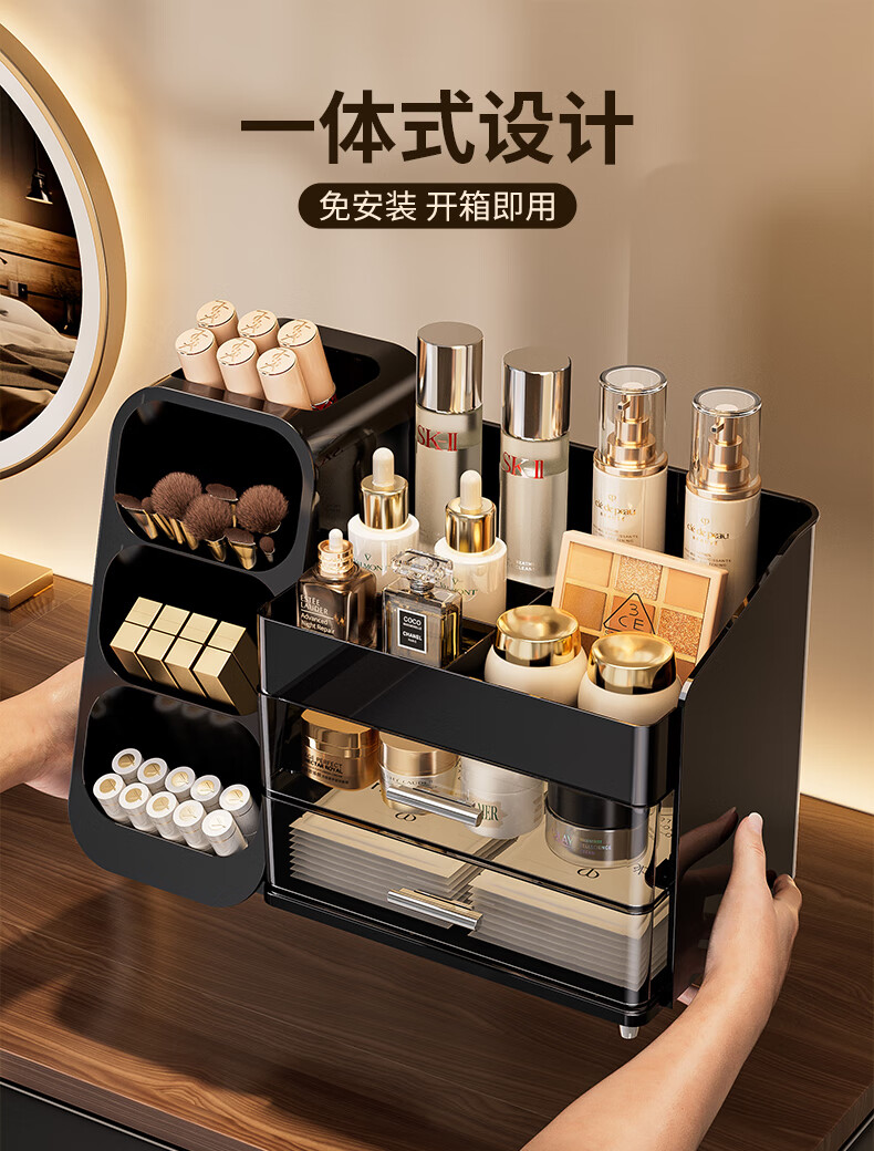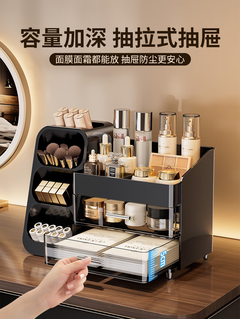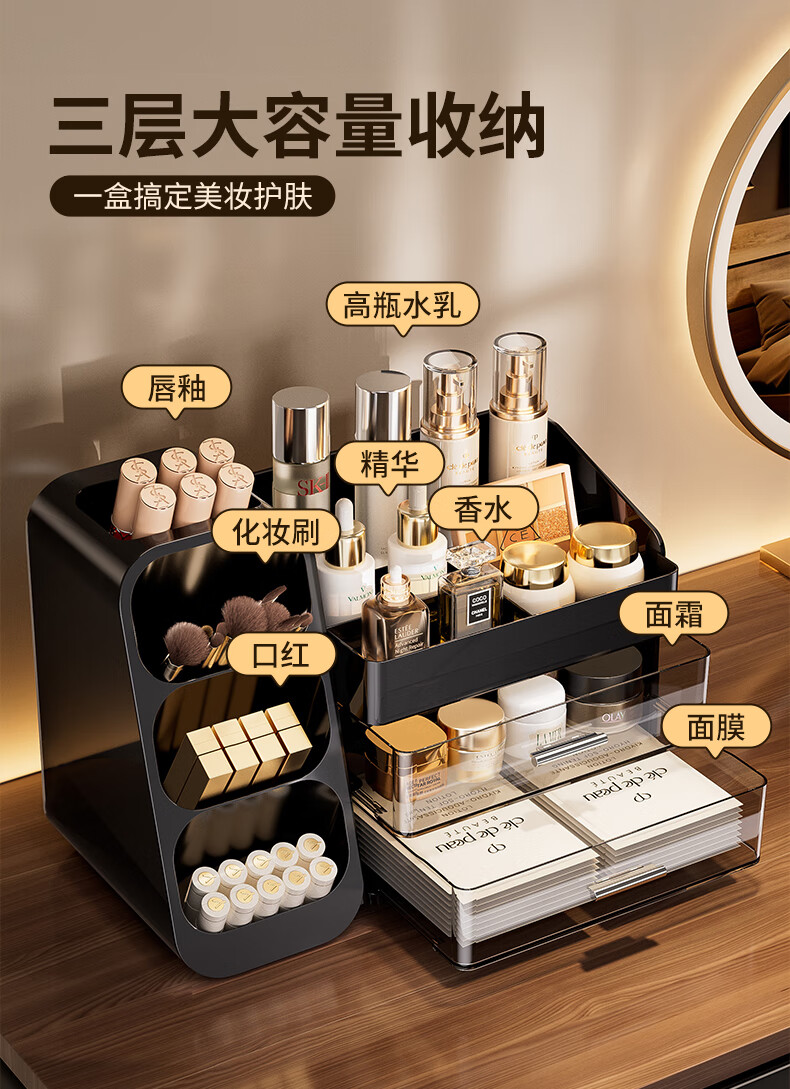 KAMAN化妆品收纳盒抽屉梳妆台桌面高级感护肤品口红整理箱大容量化妆柜 黑色【三层/大容量】1个