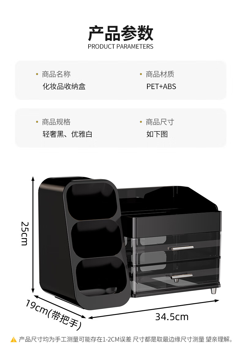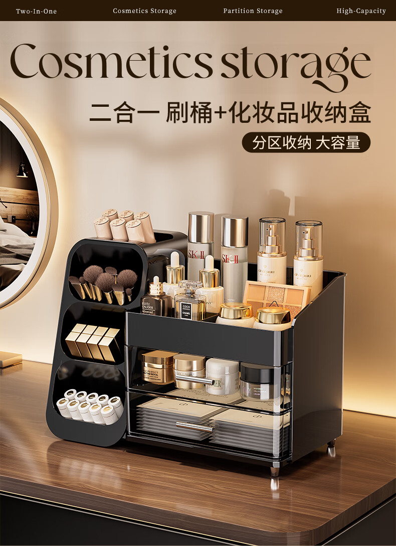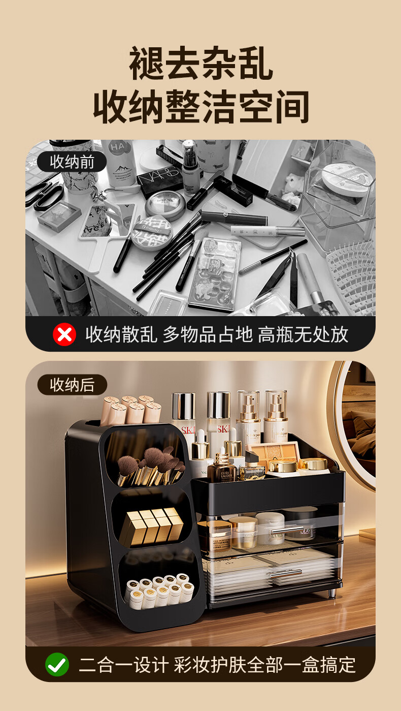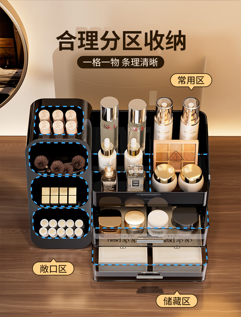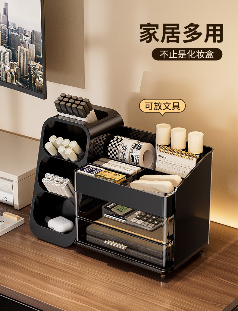 KAMAN化妆品收纳盒抽屉梳妆台桌面高级感护肤品口红整理箱大容量化妆柜 黑色【三层/大容量】1个