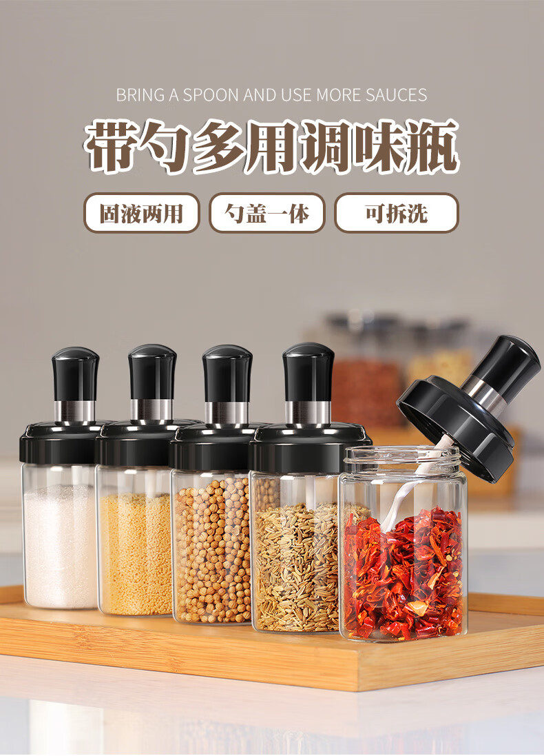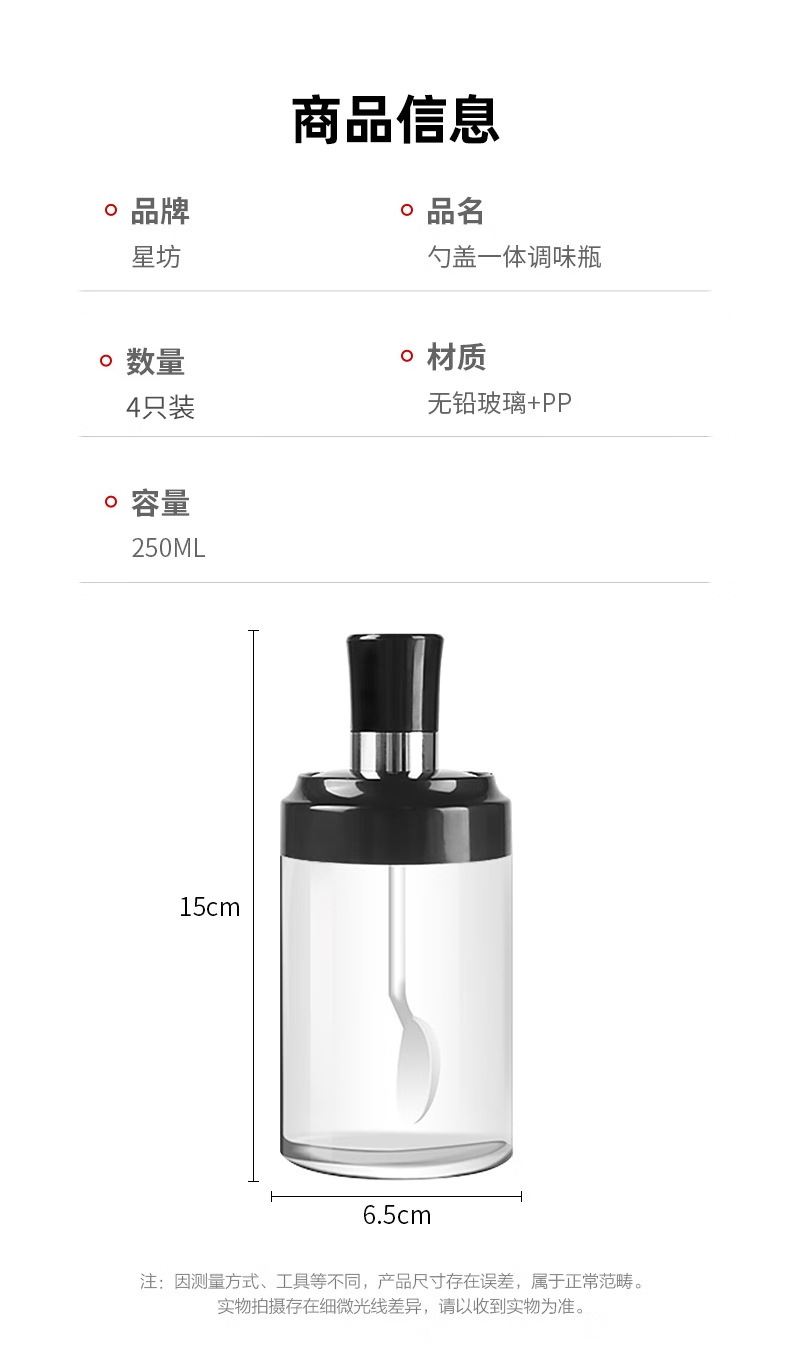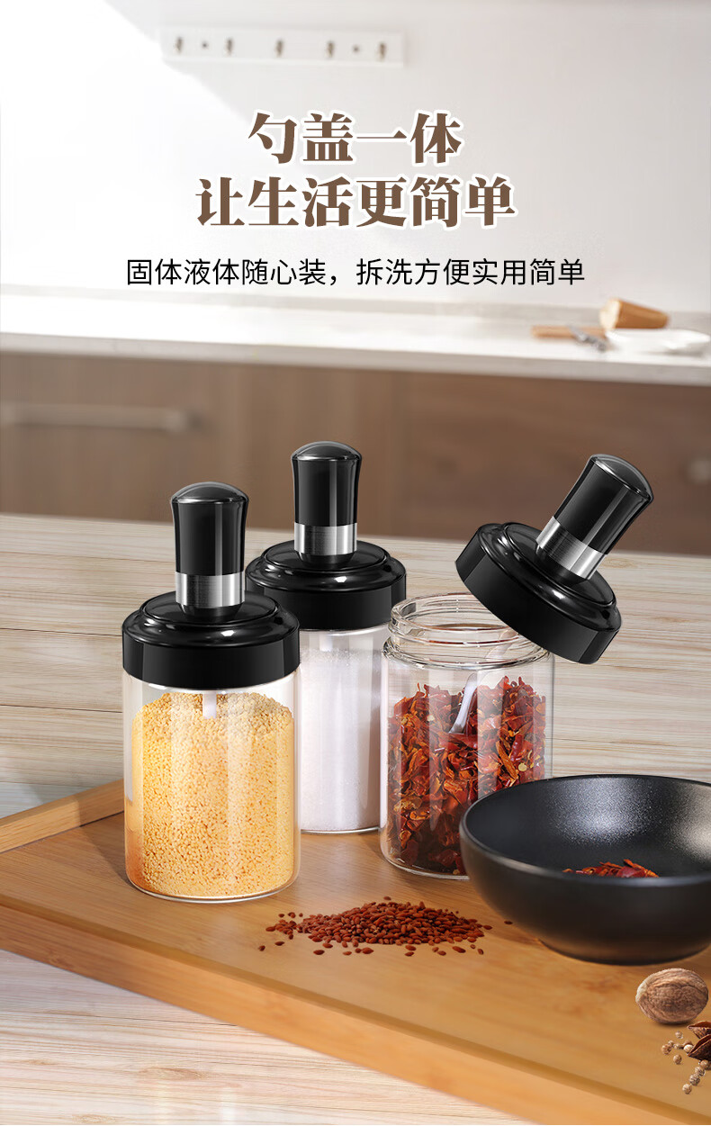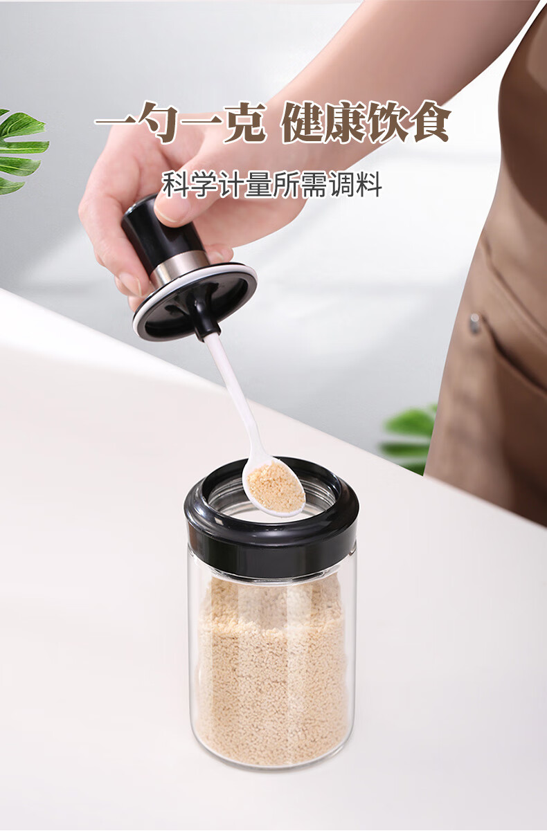 星坊玻璃盐罐烧烤调料瓶勺盖一体家用密封收纳放盐瓶白糖罐4只装