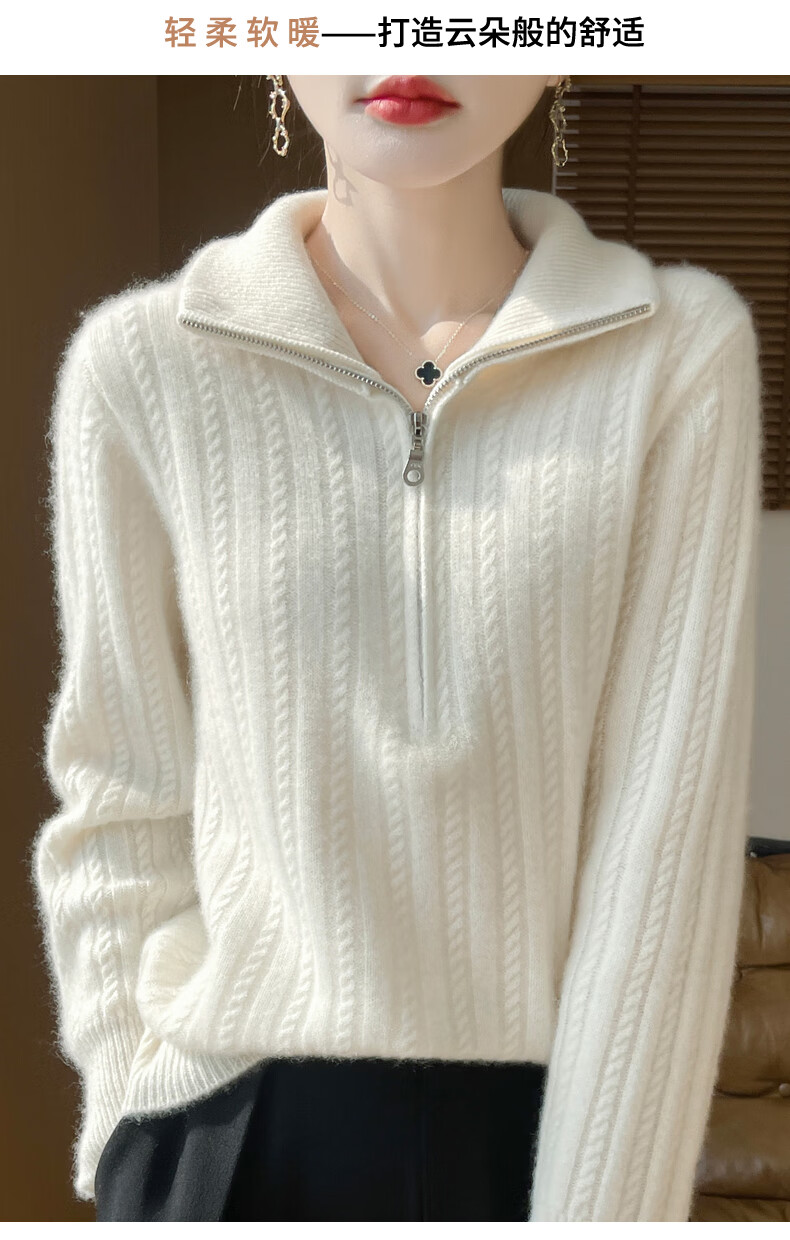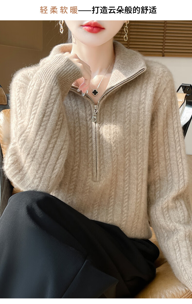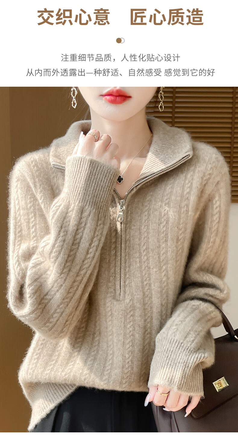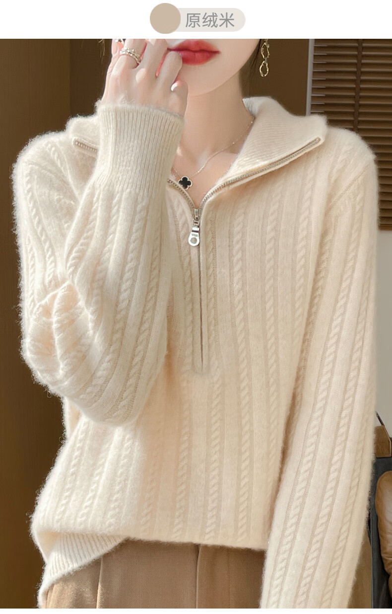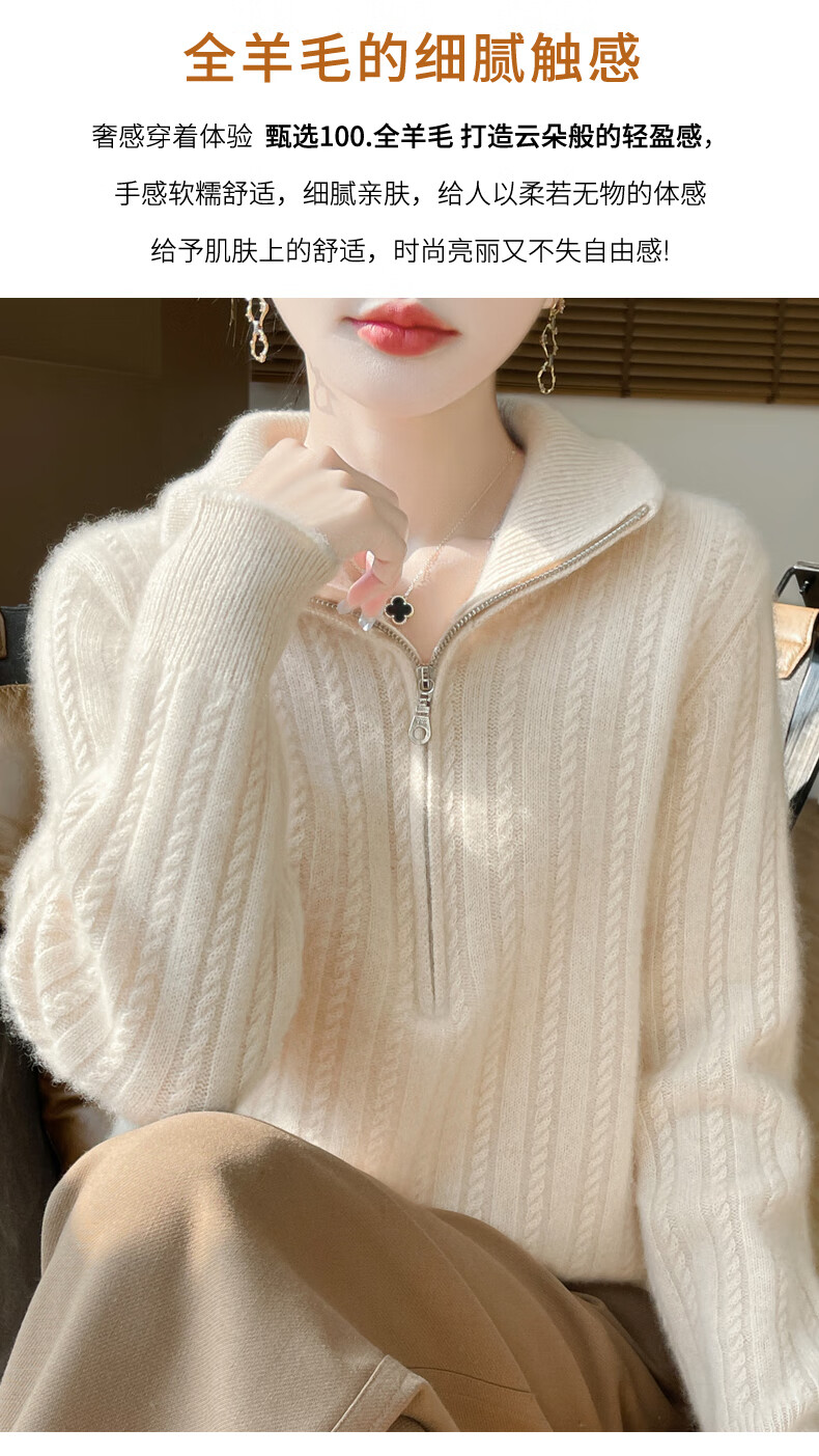 恒源祥立领加厚100%纯羊毛衫女高翻领半拉链麻花软糯毛衣宽松扭花针织衫 原绒米 L 【建议115-135斤】