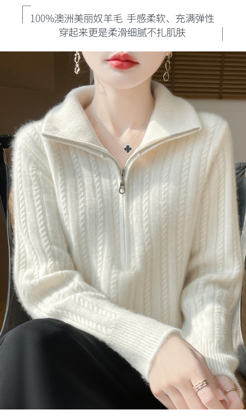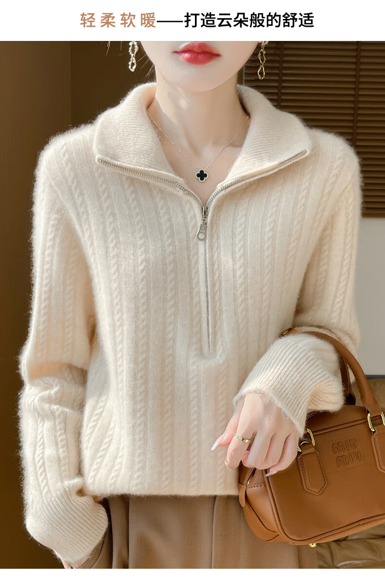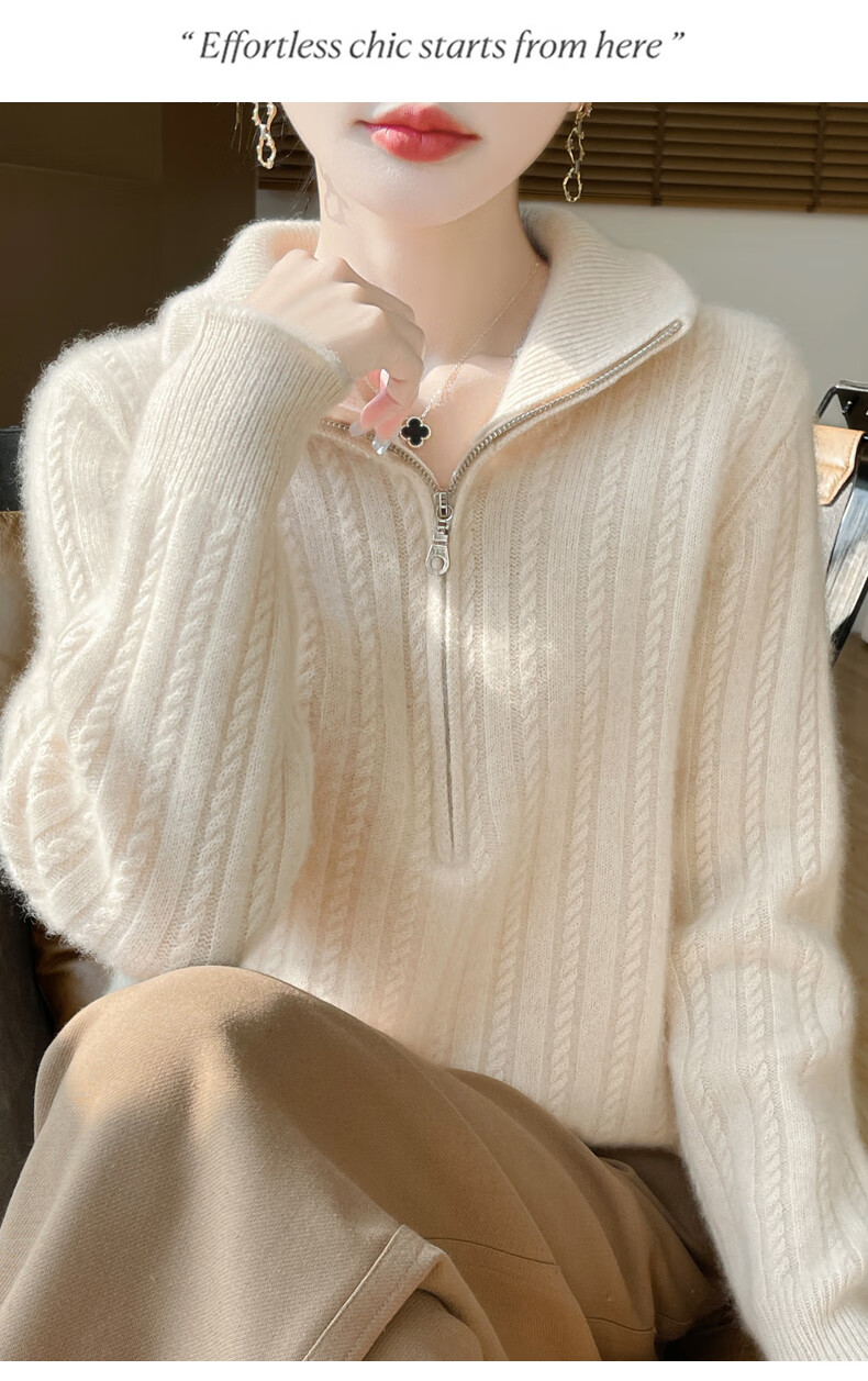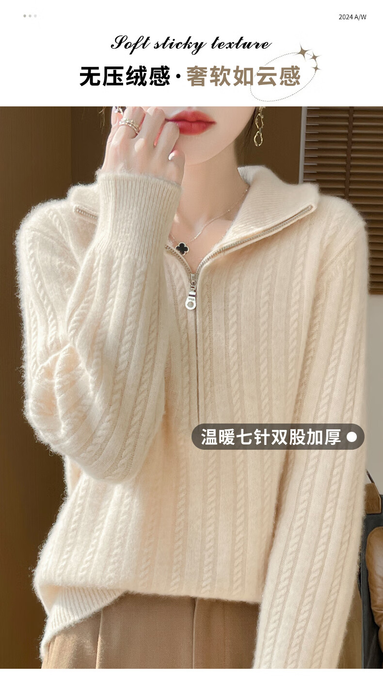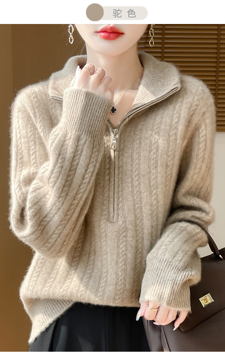 恒源祥立领加厚100%纯羊毛衫女高翻领半拉链麻花软糯毛衣宽松扭花针织衫 原绒米 L 【建议115-135斤】
