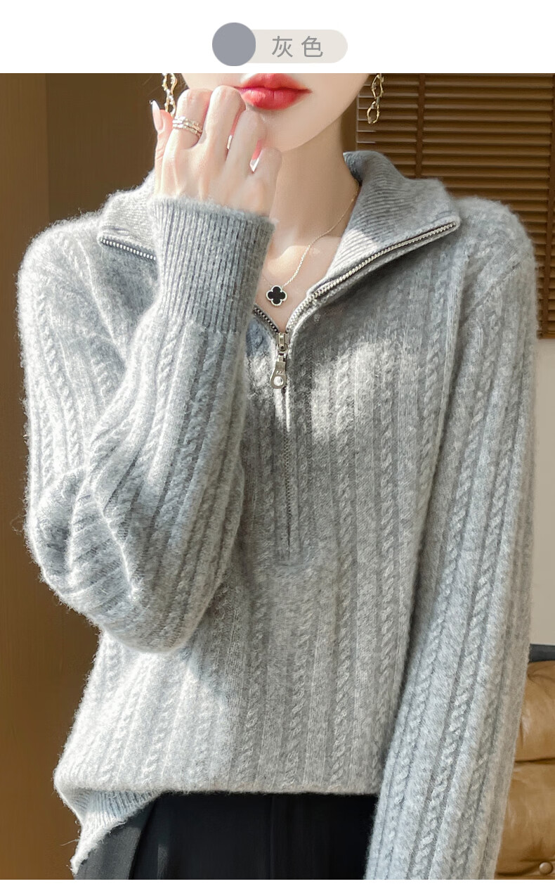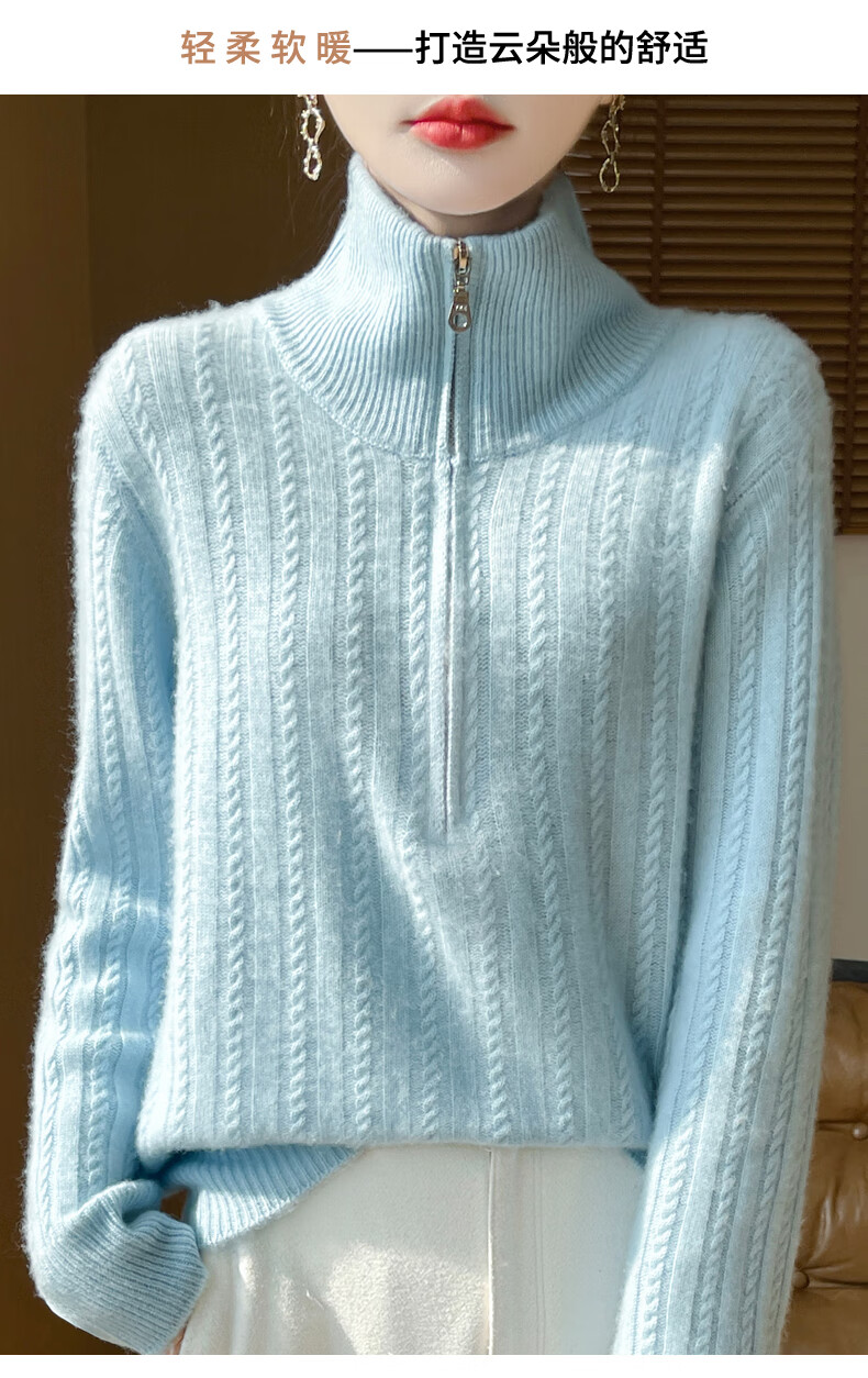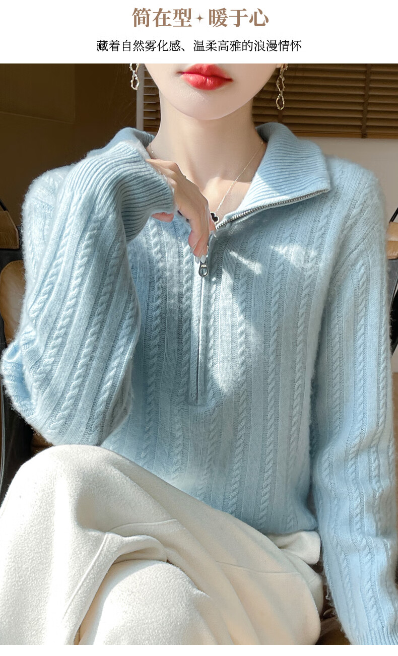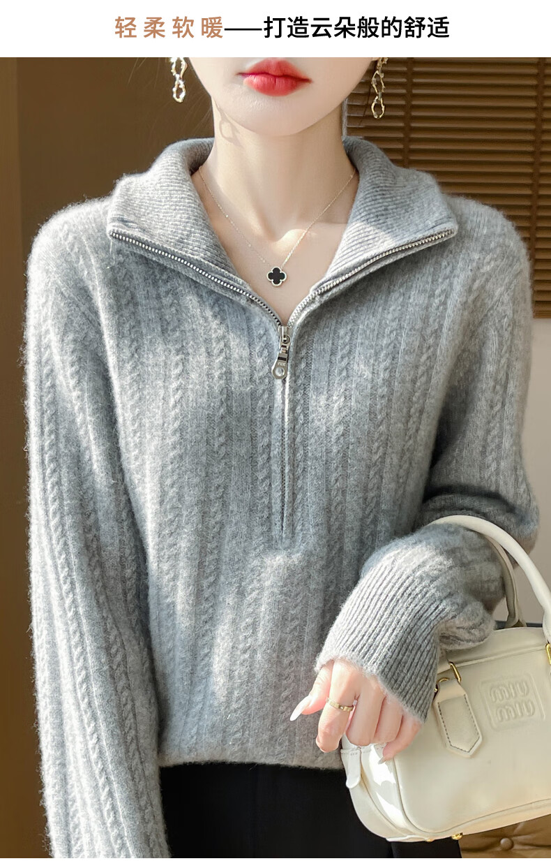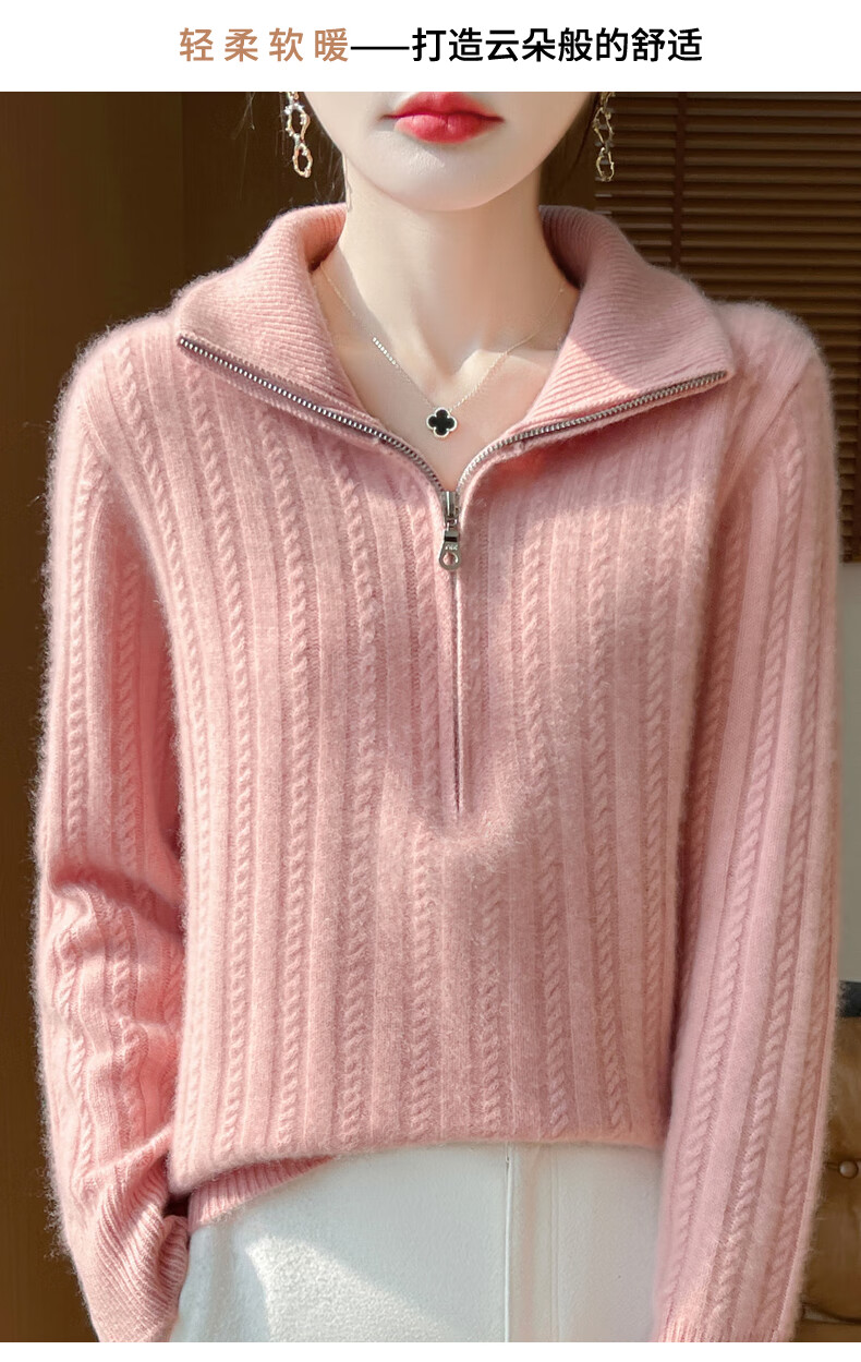 恒源祥立领加厚100%纯羊毛衫女高翻领半拉链麻花软糯毛衣宽松扭花针织衫 原绒米 L 【建议115-135斤】