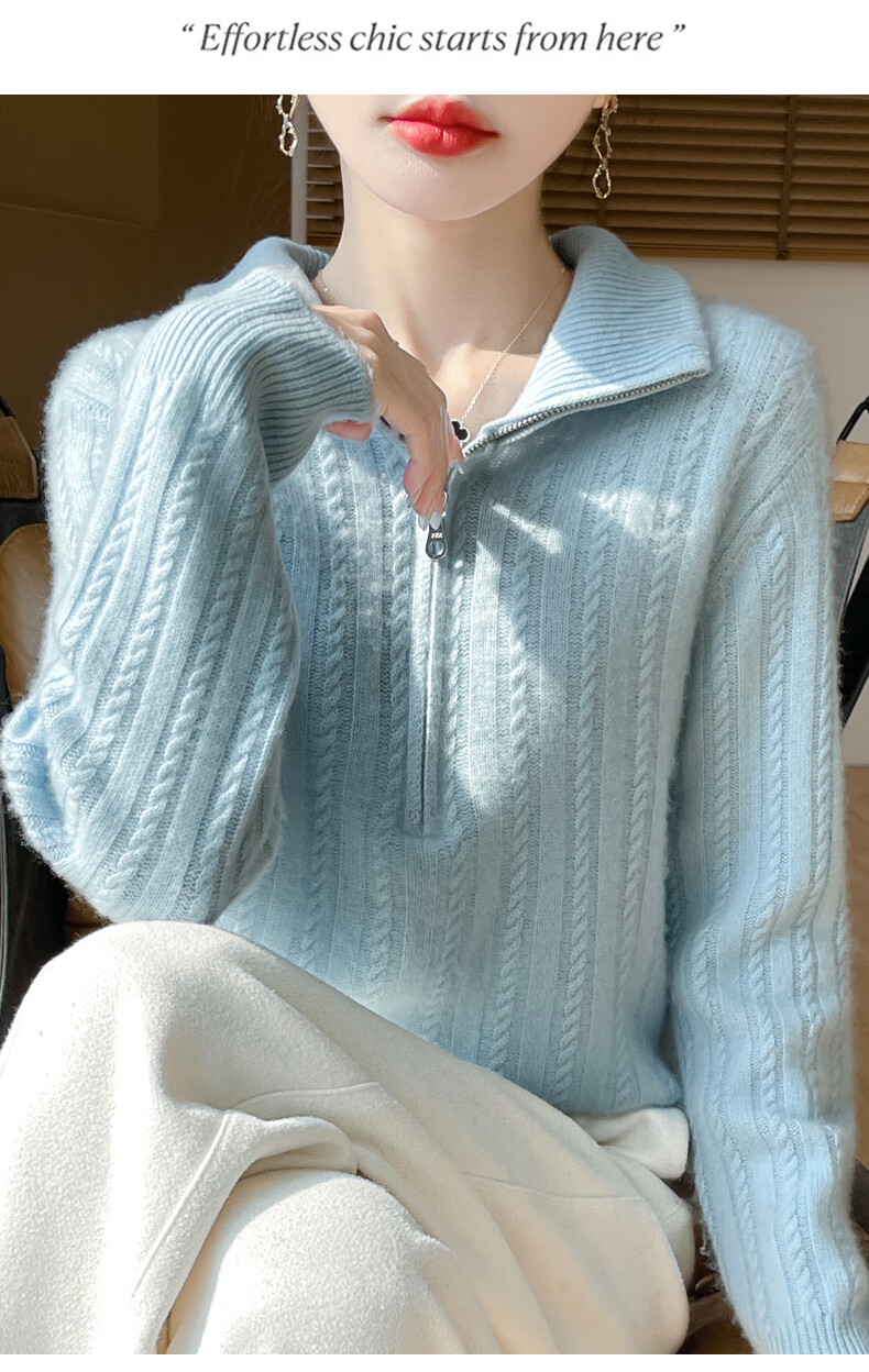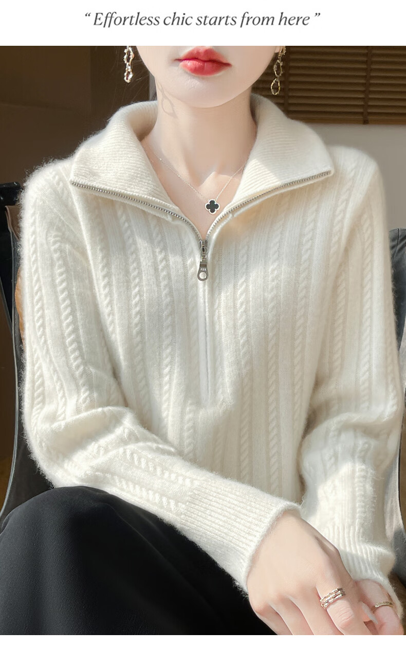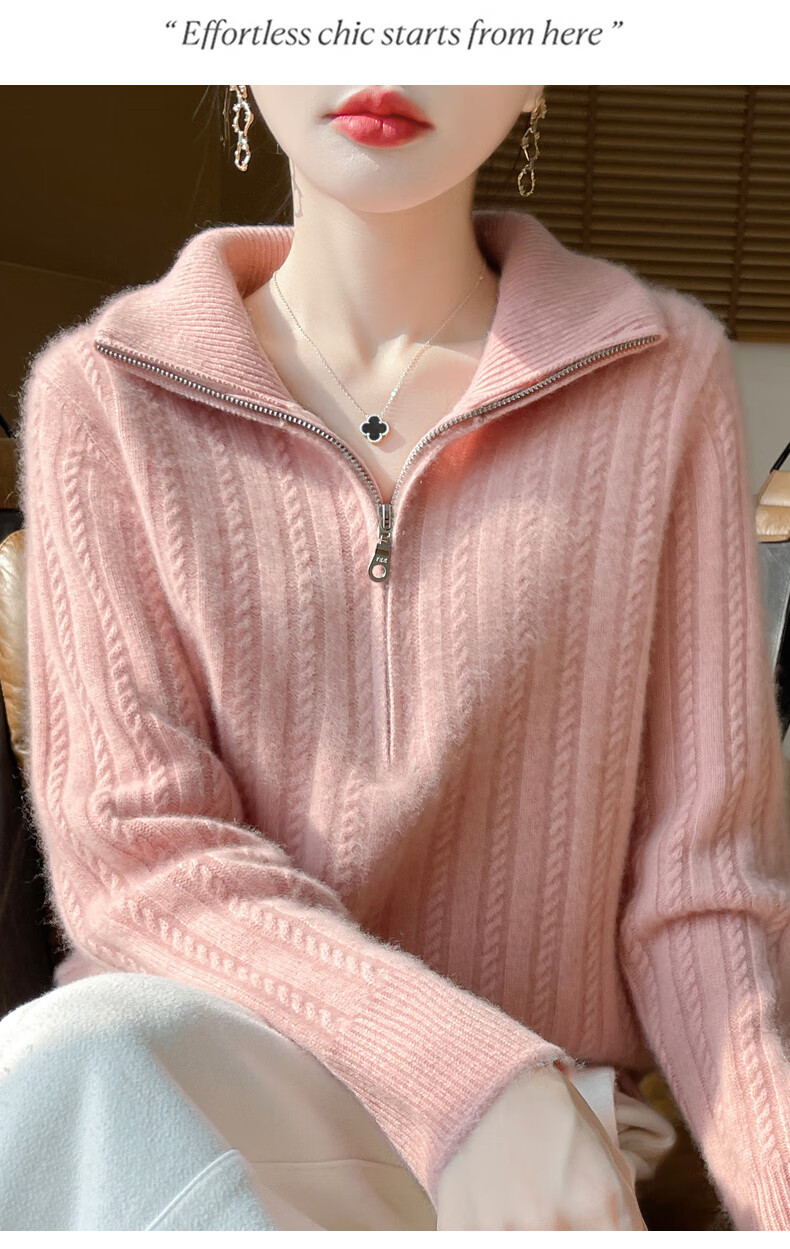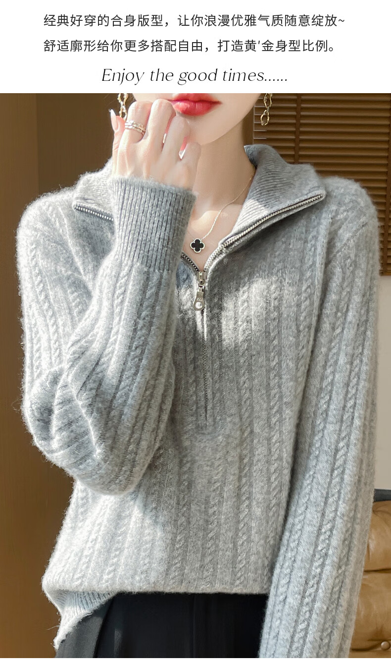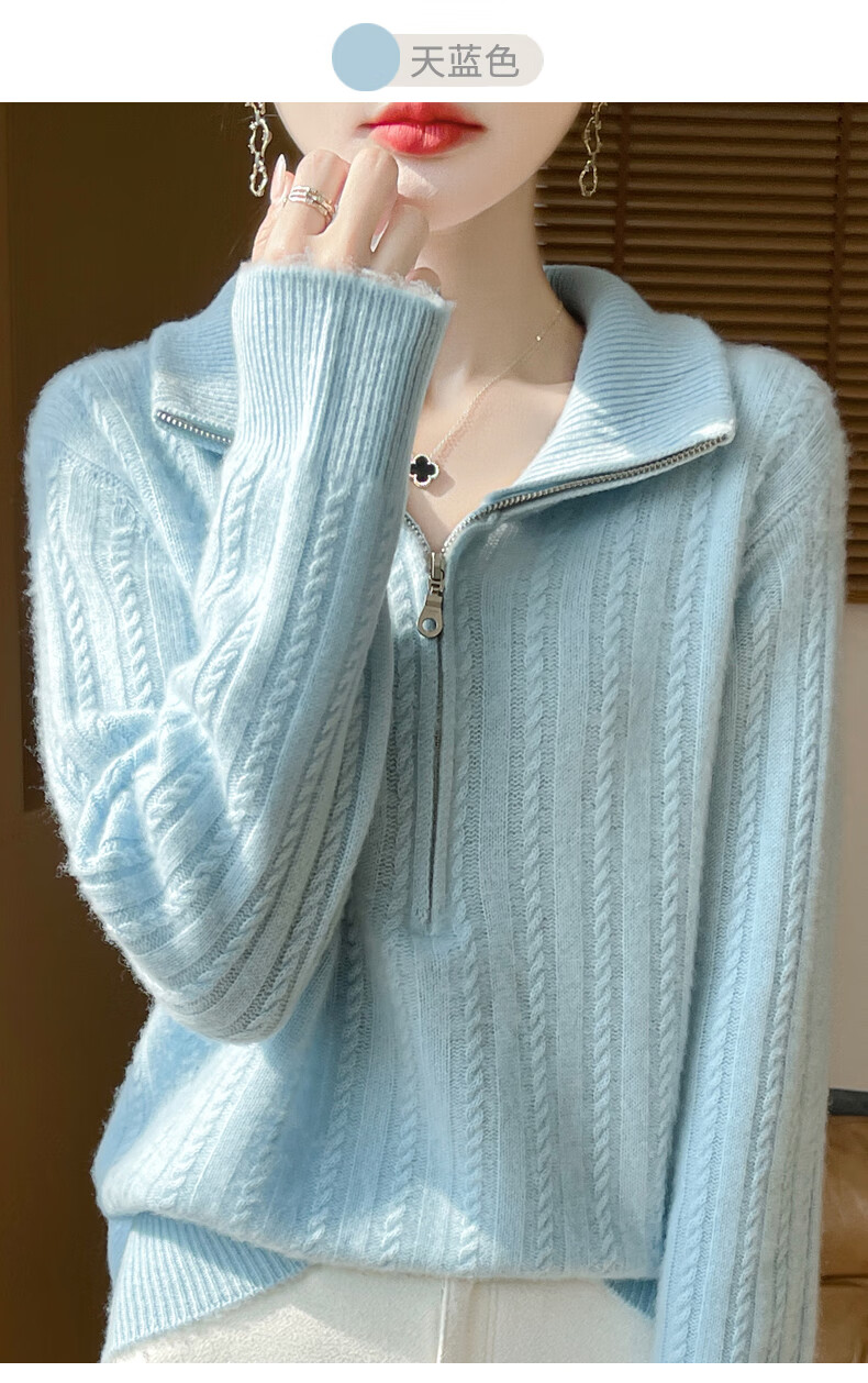 恒源祥立领加厚100%纯羊毛衫女高翻领半拉链麻花软糯毛衣宽松扭花针织衫 原绒米 L 【建议115-135斤】