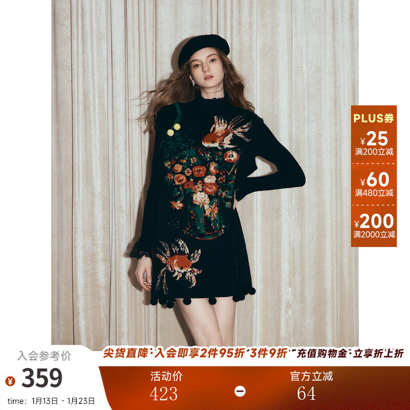 两三事梵高文艺西西里午后2026冬新款金鱼图案毛球摆背心裙连衣裙 黑色-y L