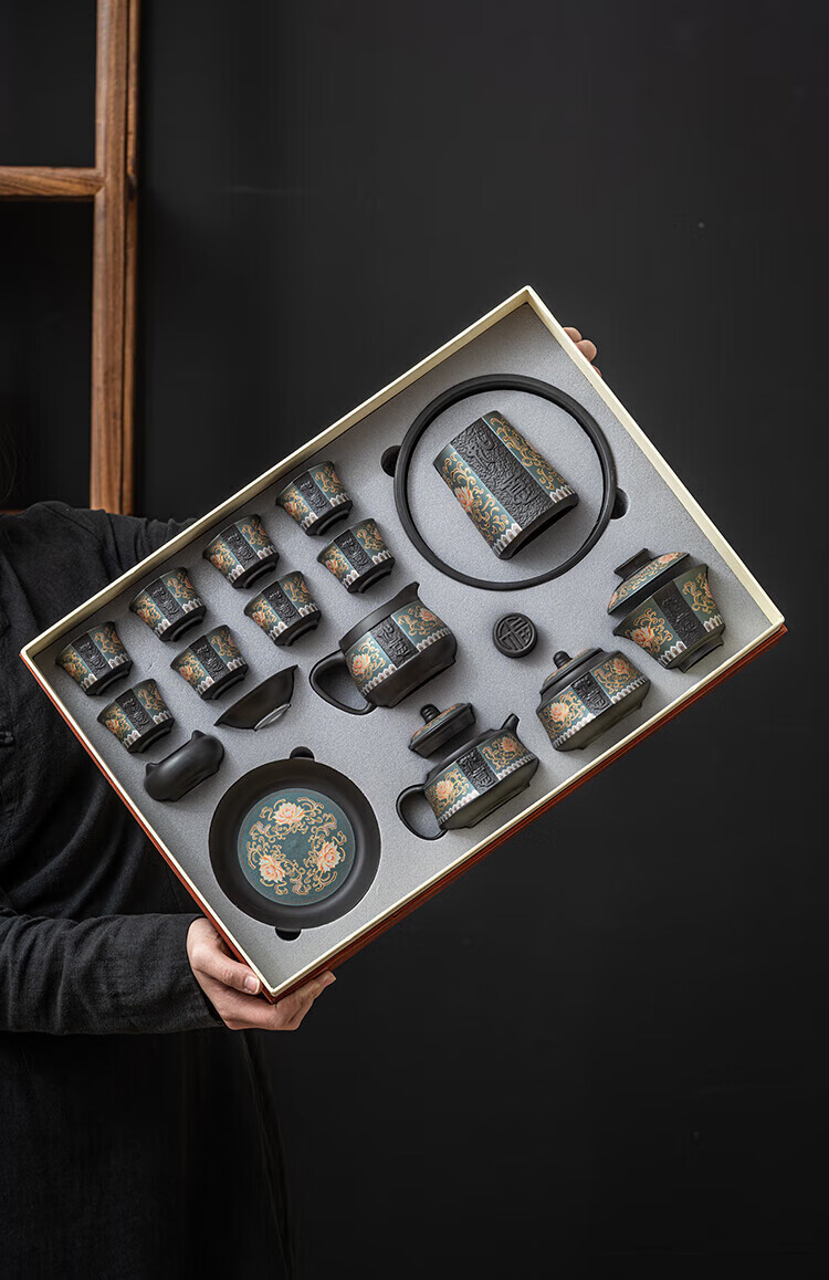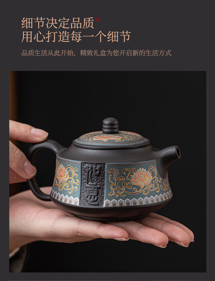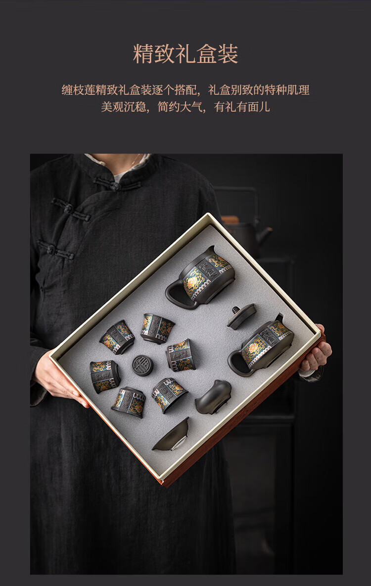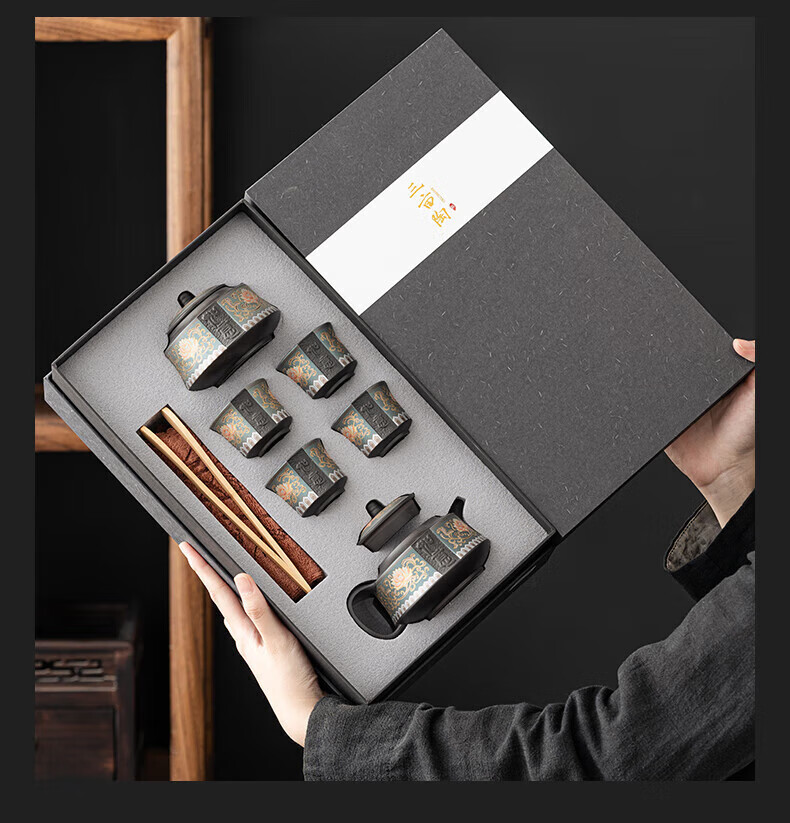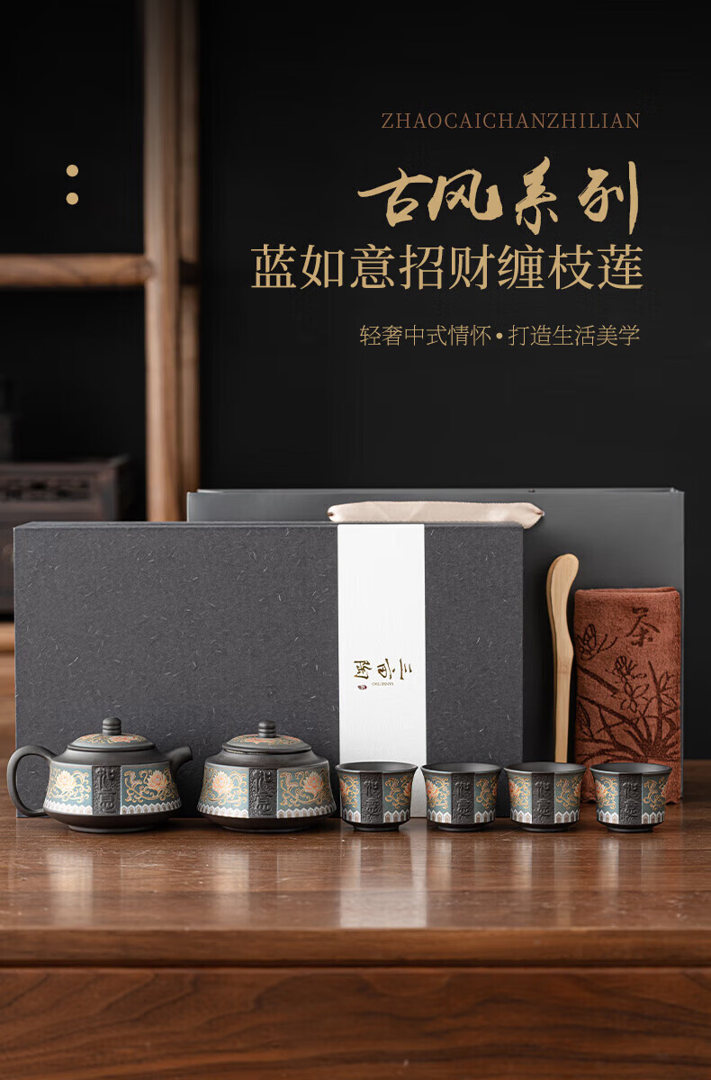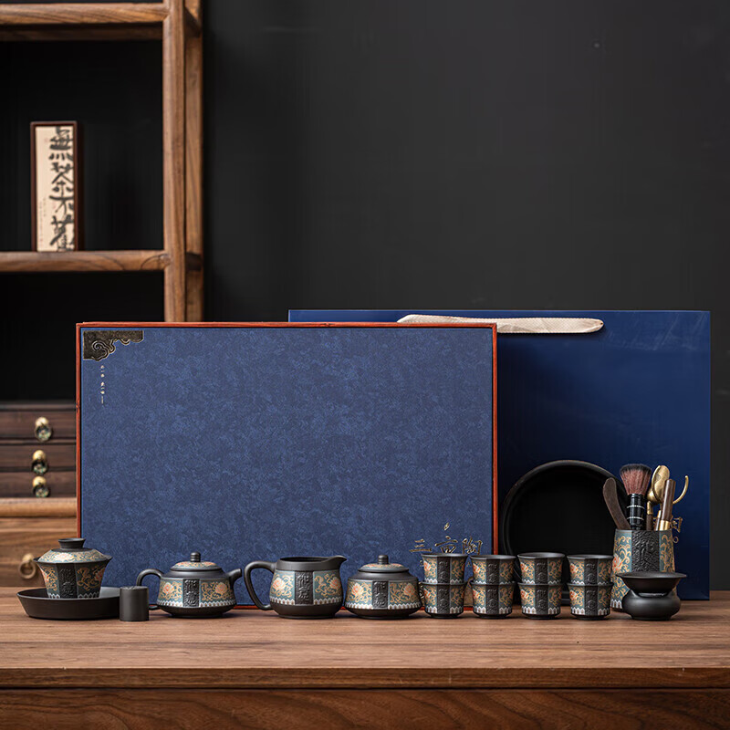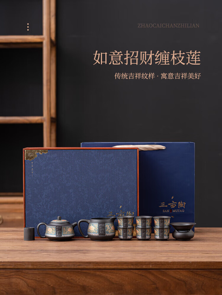 教师节礼物紫砂茶壶套装整套伴手礼商务礼品生日礼物男士 蓝如意缠枝高端礼盒装6头