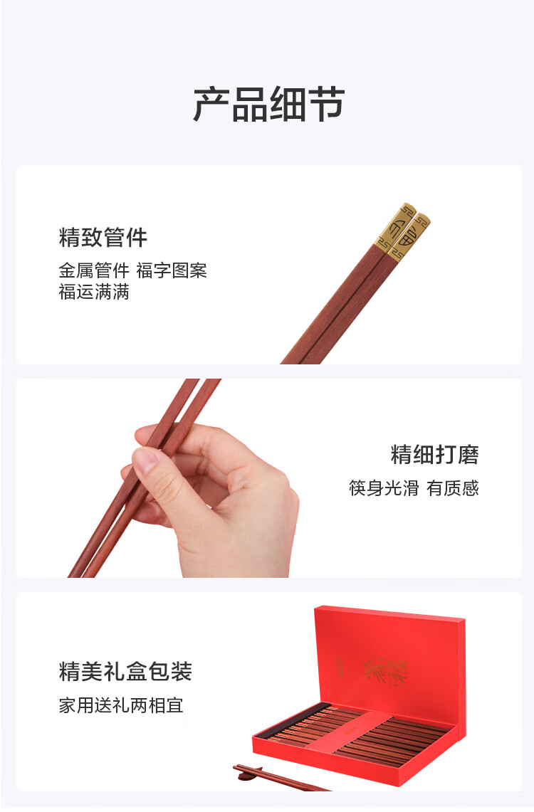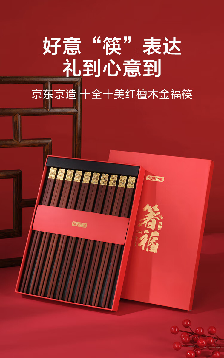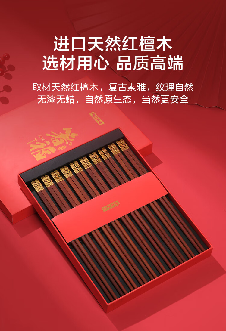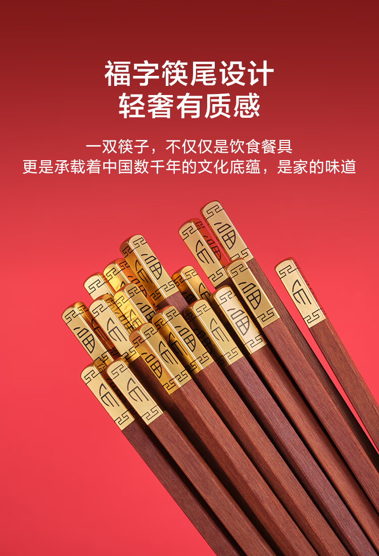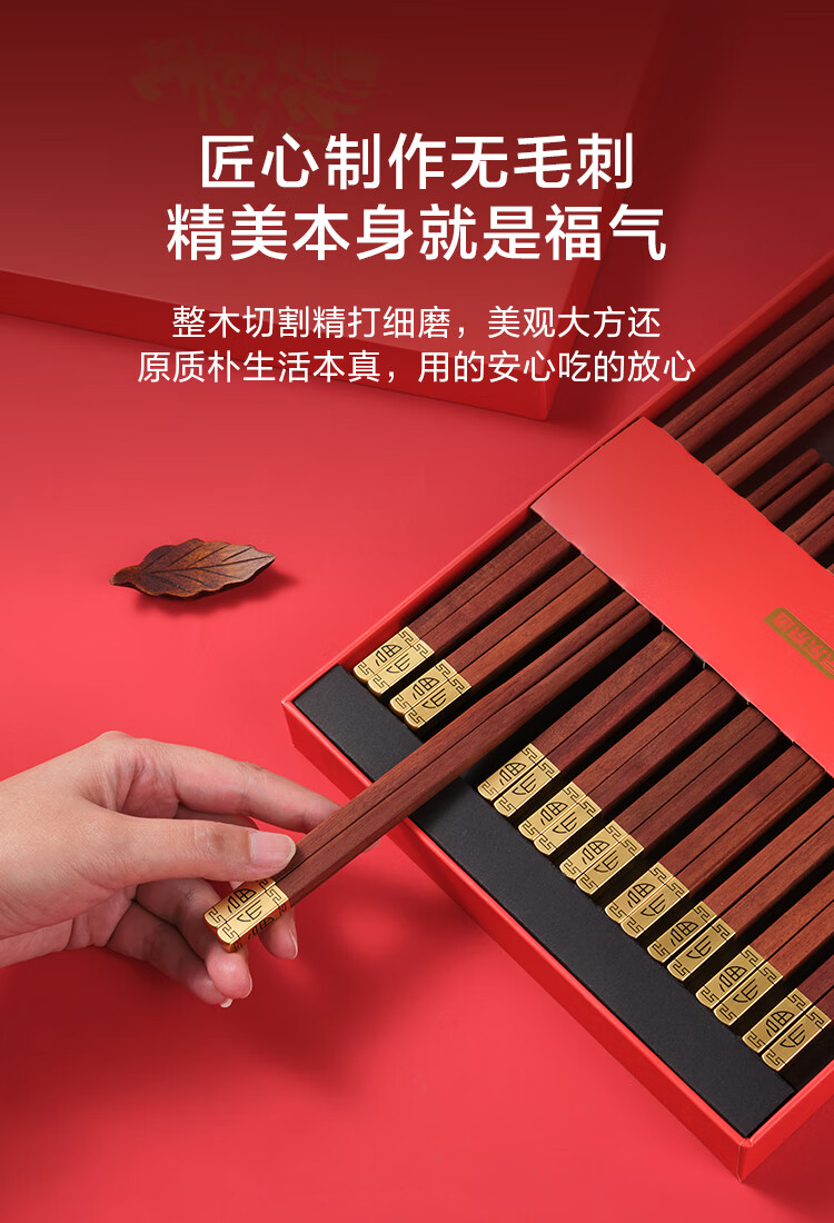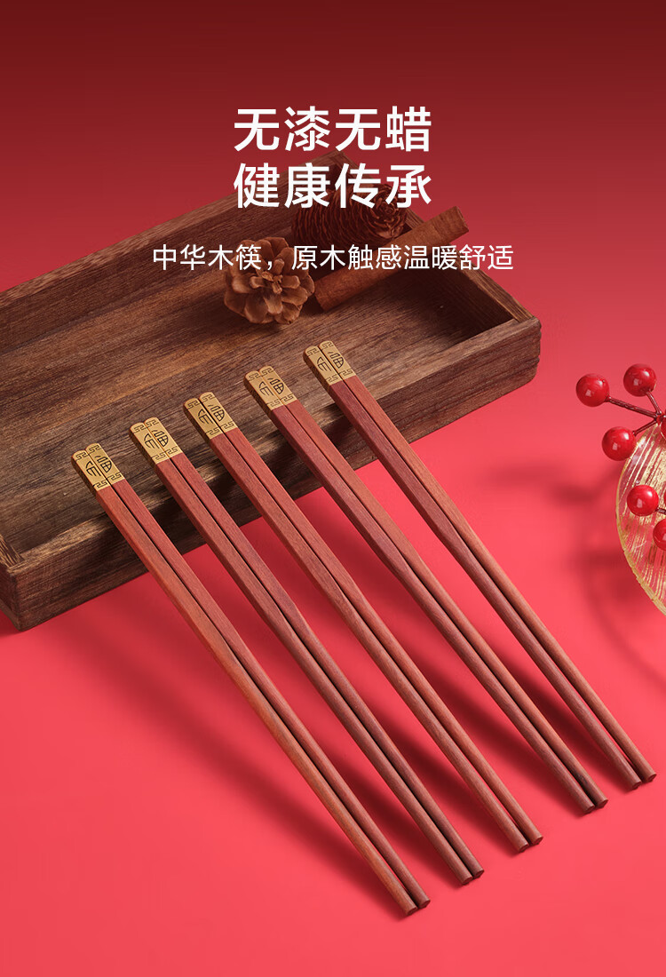 京东京造 筷子 家用餐具无漆无蜡红檀木【金福筷头】10双 礼盒装