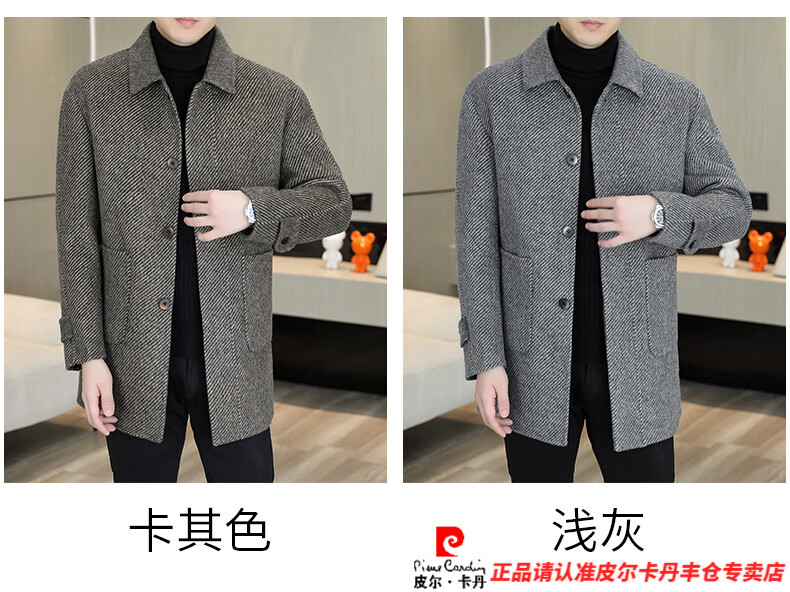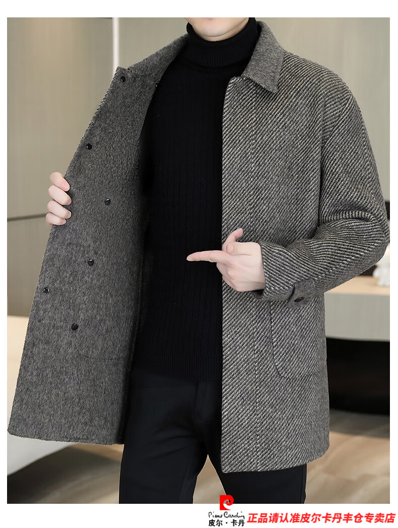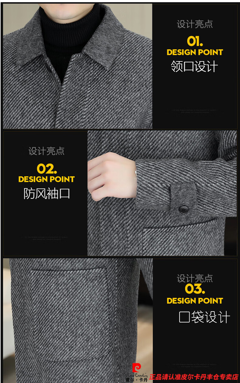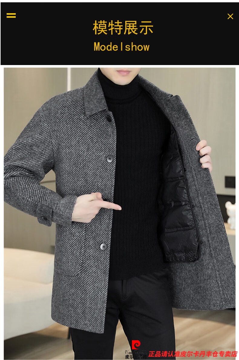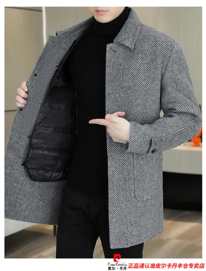 皮尔卡丹(pierre cardin)高端羊毛大衣男翻领脱卸鹅绒内胆复古双面羊绒外套中年爸爸冬装 浅灰色【可脱卸鹅绒内胆】 M 170