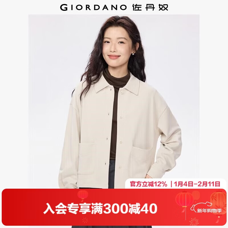 佐丹奴衬衫外套女秋冬新款双口袋宽松翻领短款卫衣开衫女05375860
