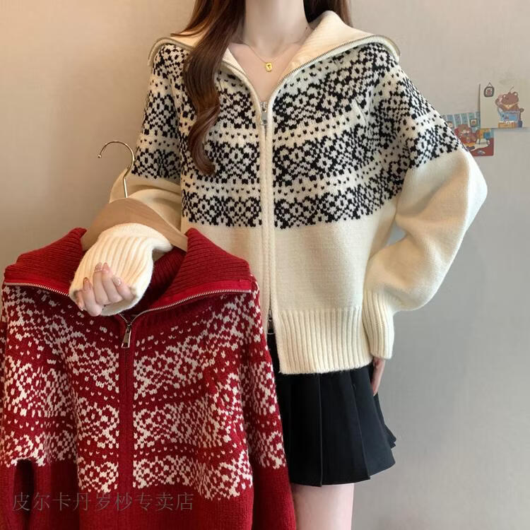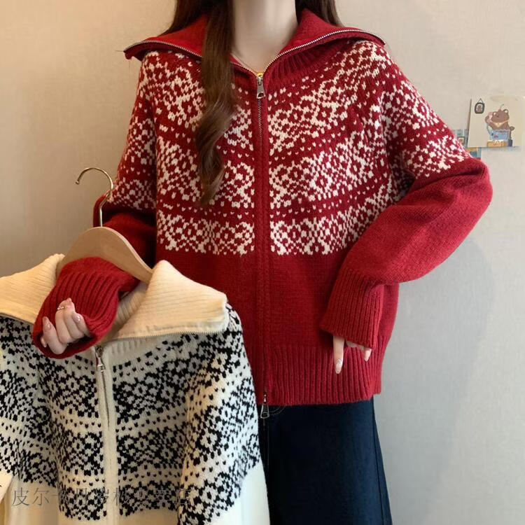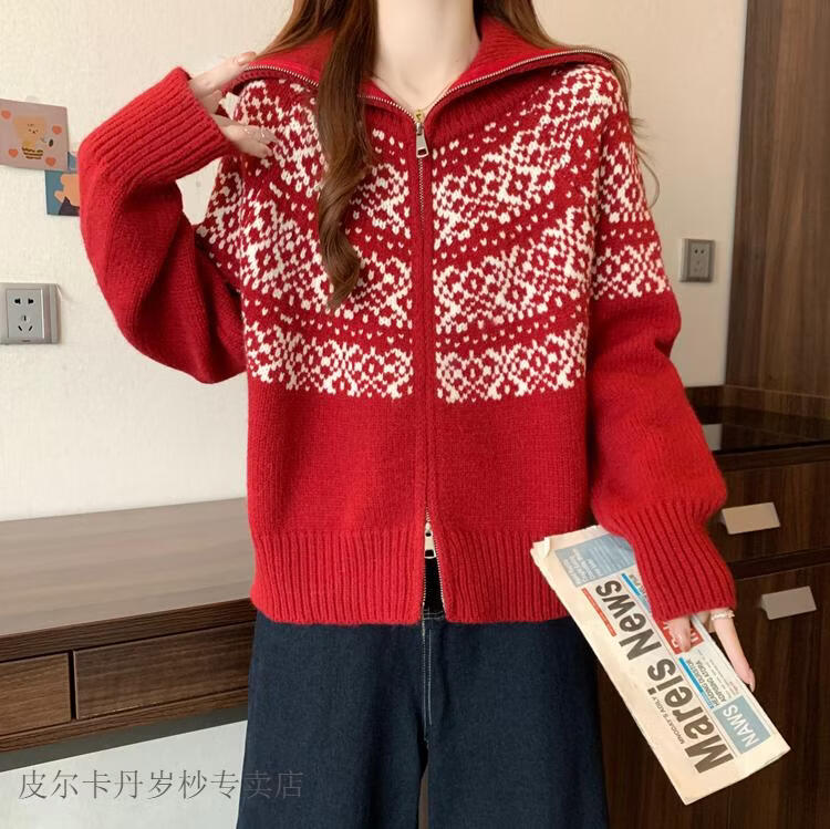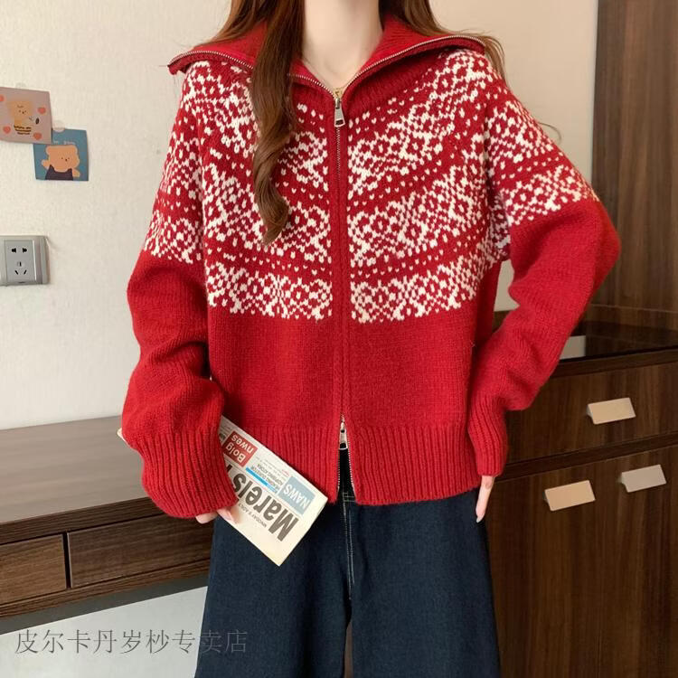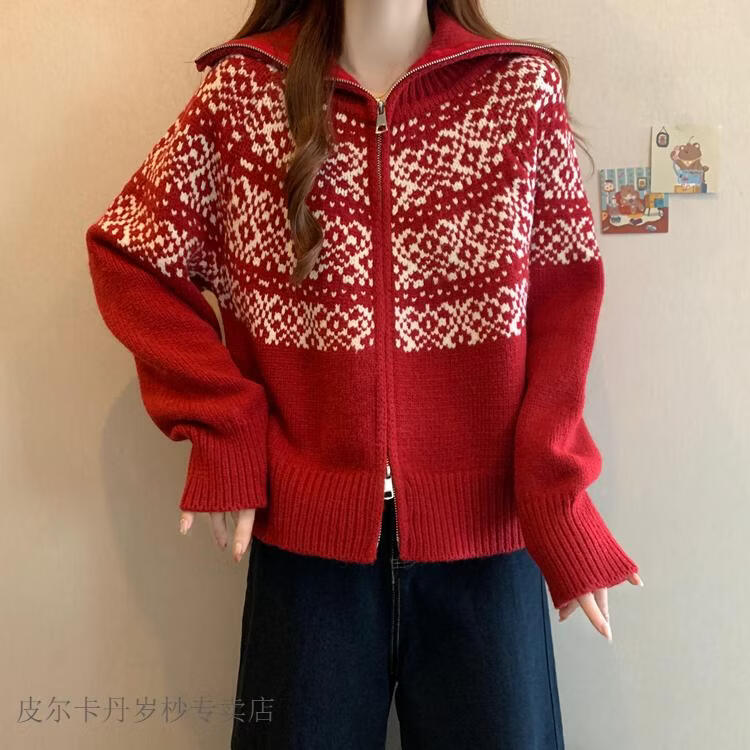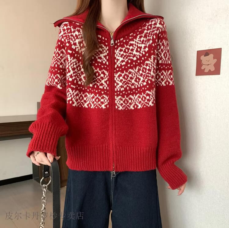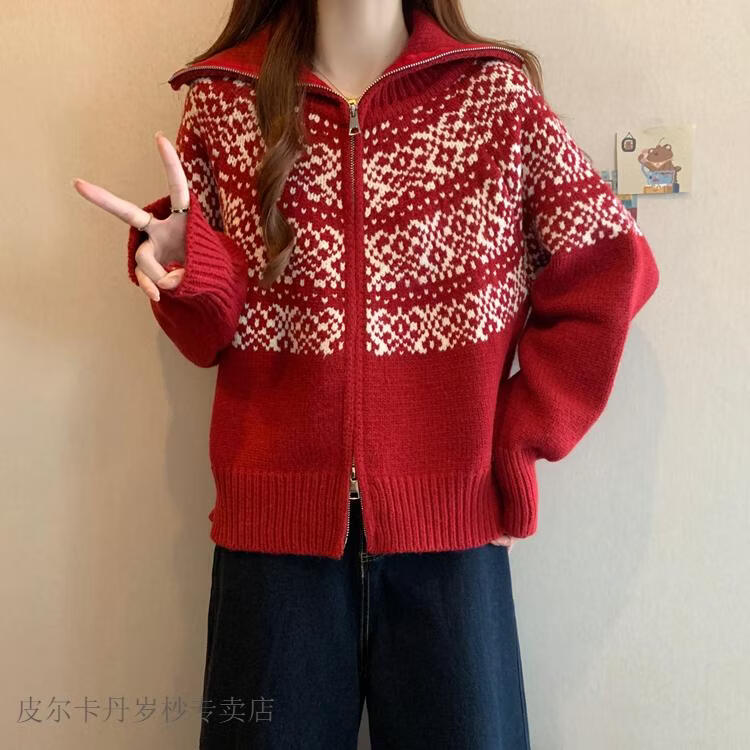 皮尔卡丹费尔岛红色翻领正肩毛衣外套女2025秋冬新款大码胖mm圣诞针织开衫 红色毛衣【今年爆款/小众/巨显瘦/遮肉/别致/藏肉 L (100-120斤)