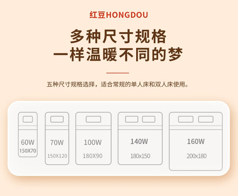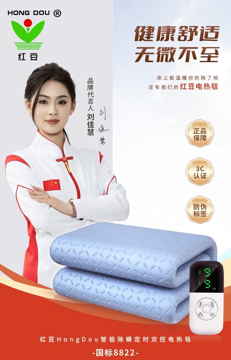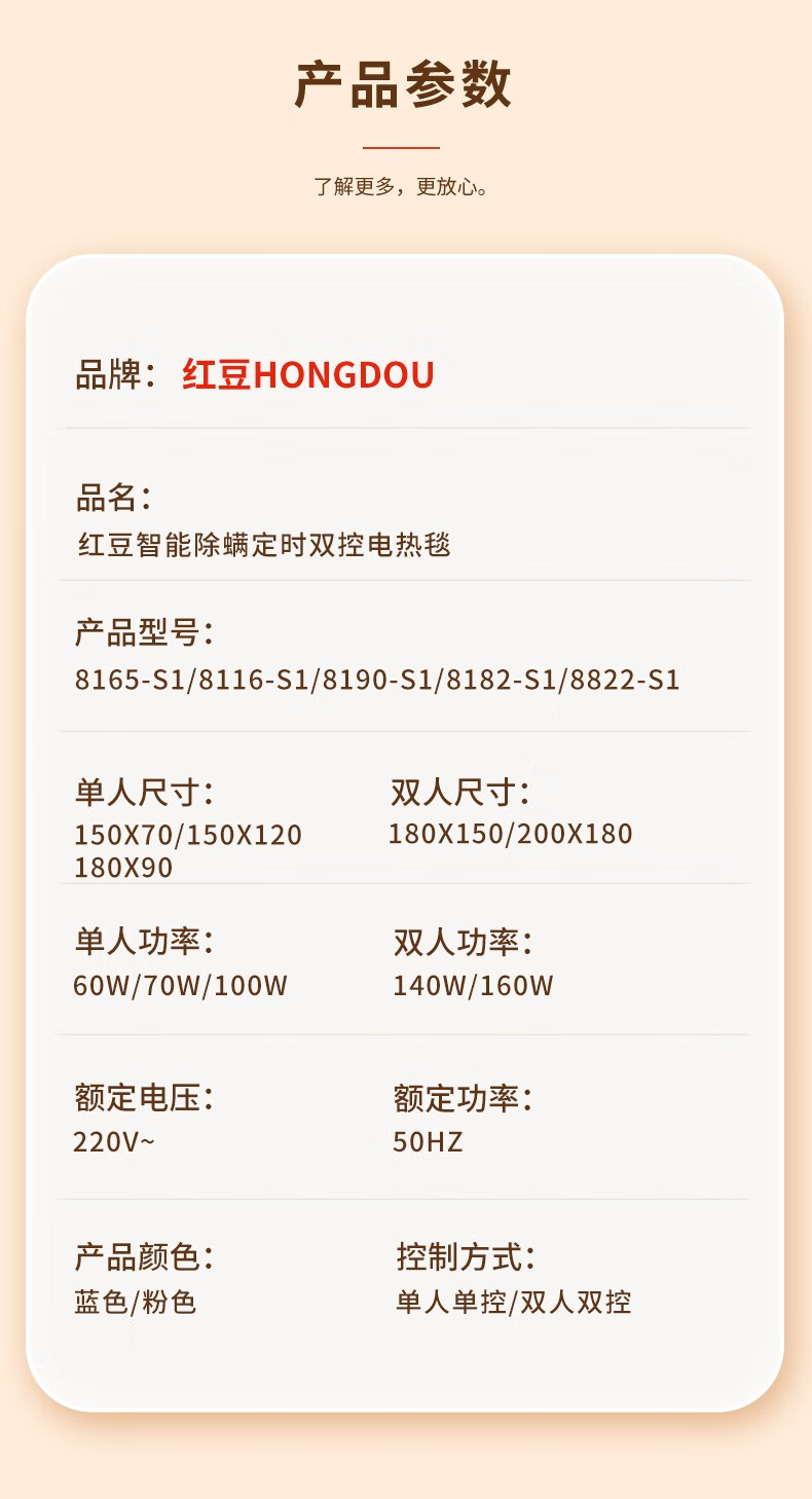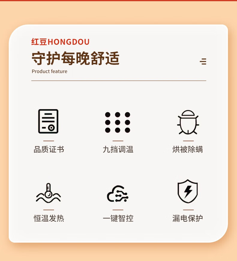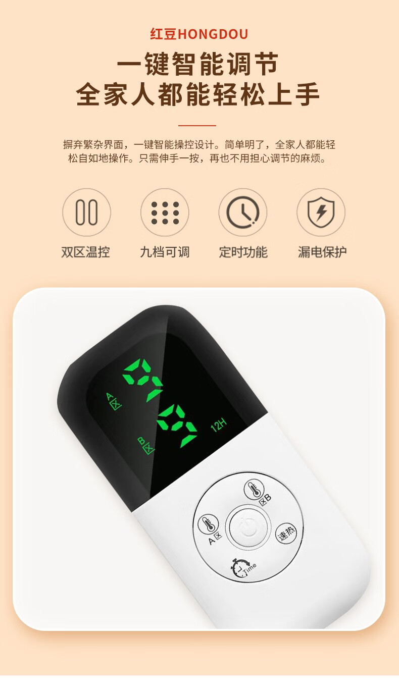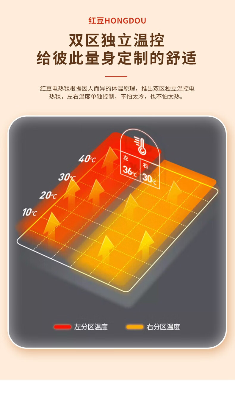 红豆HongDou电热毯智能除螨定时双温双控电热毯 4D工艺-单温单控长1.8宽0.9米