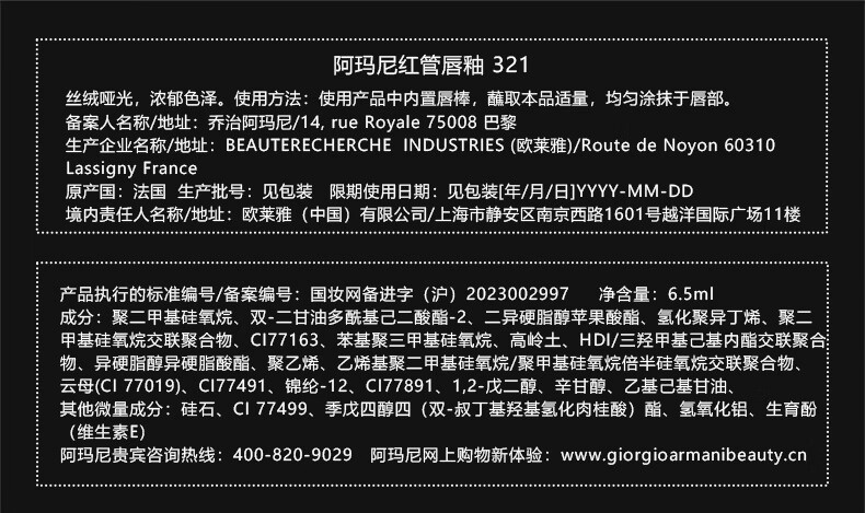 阿玛尼梦中人红管唇釉#321心动粉 素颜显白口红不沾杯润唇膏新年礼物