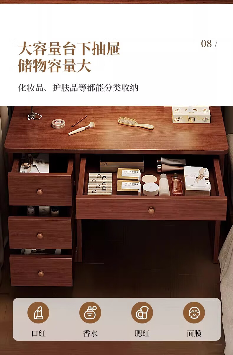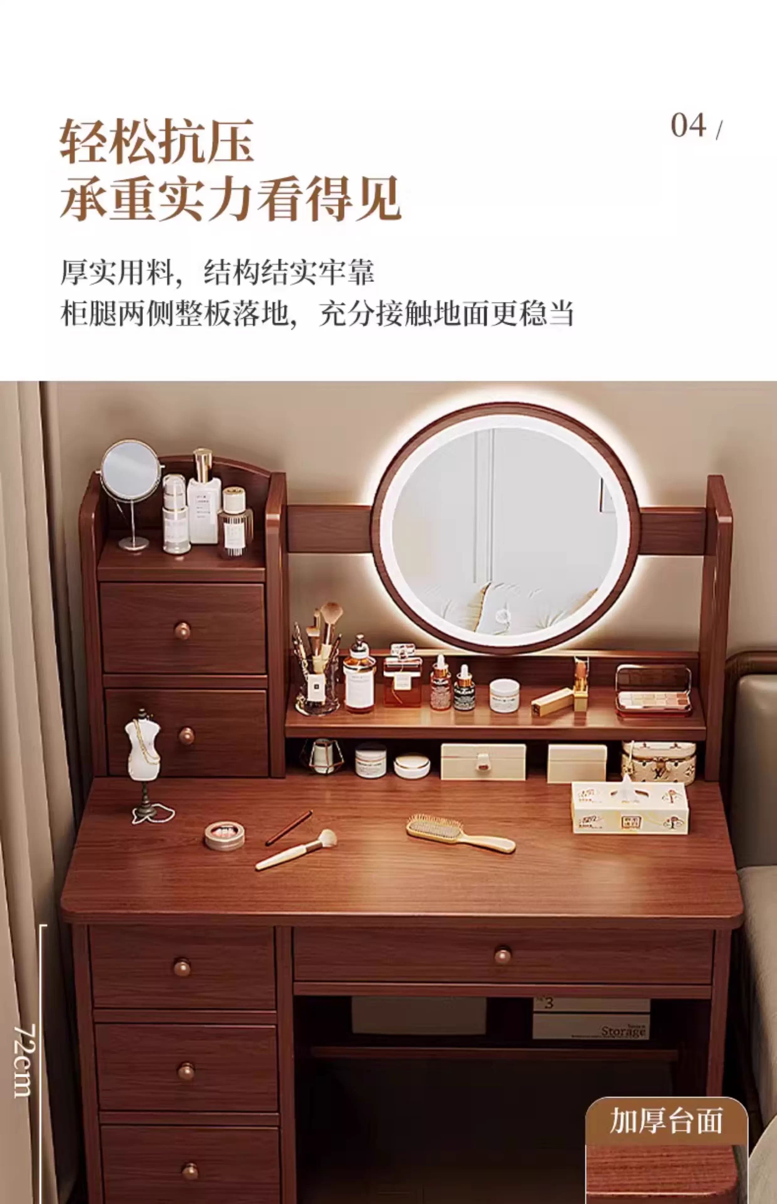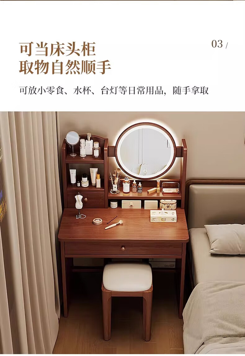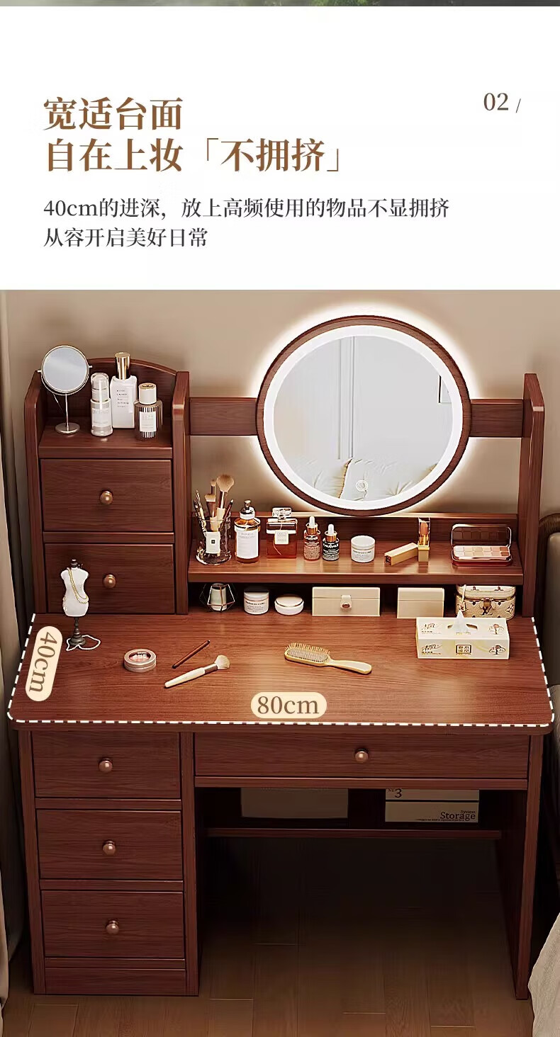 左度实木梳妆台卧室现代简约2025新款小户型斗柜一体轻奢高级感化妆桌 力荐【两抽三门+LED灯】深胡桃色80cm 【加厚实木】梳妆台