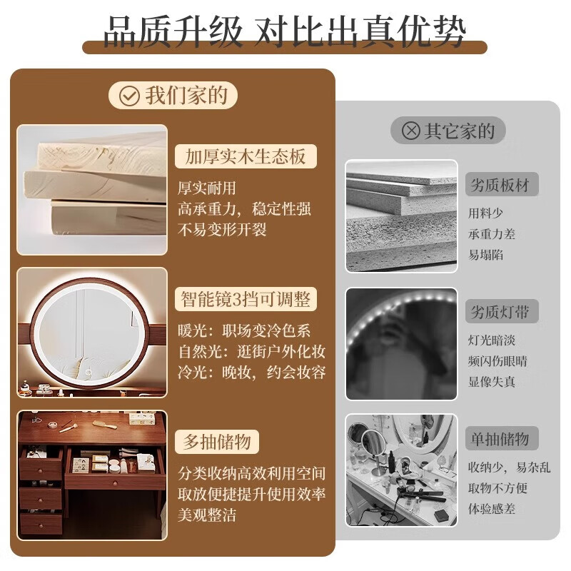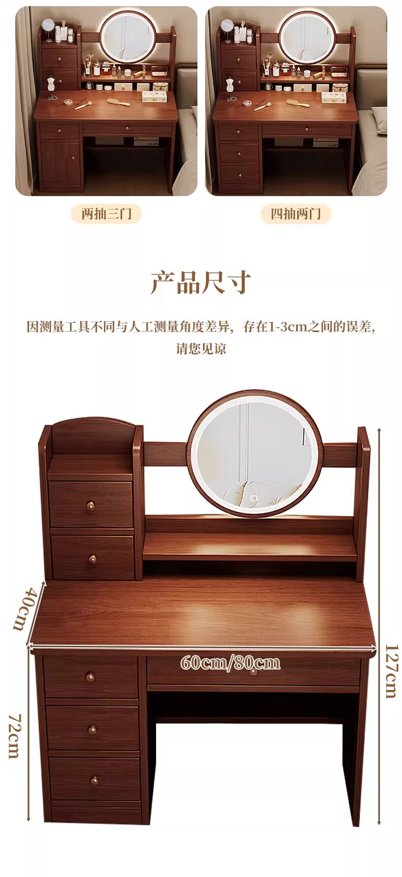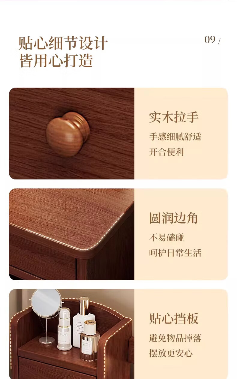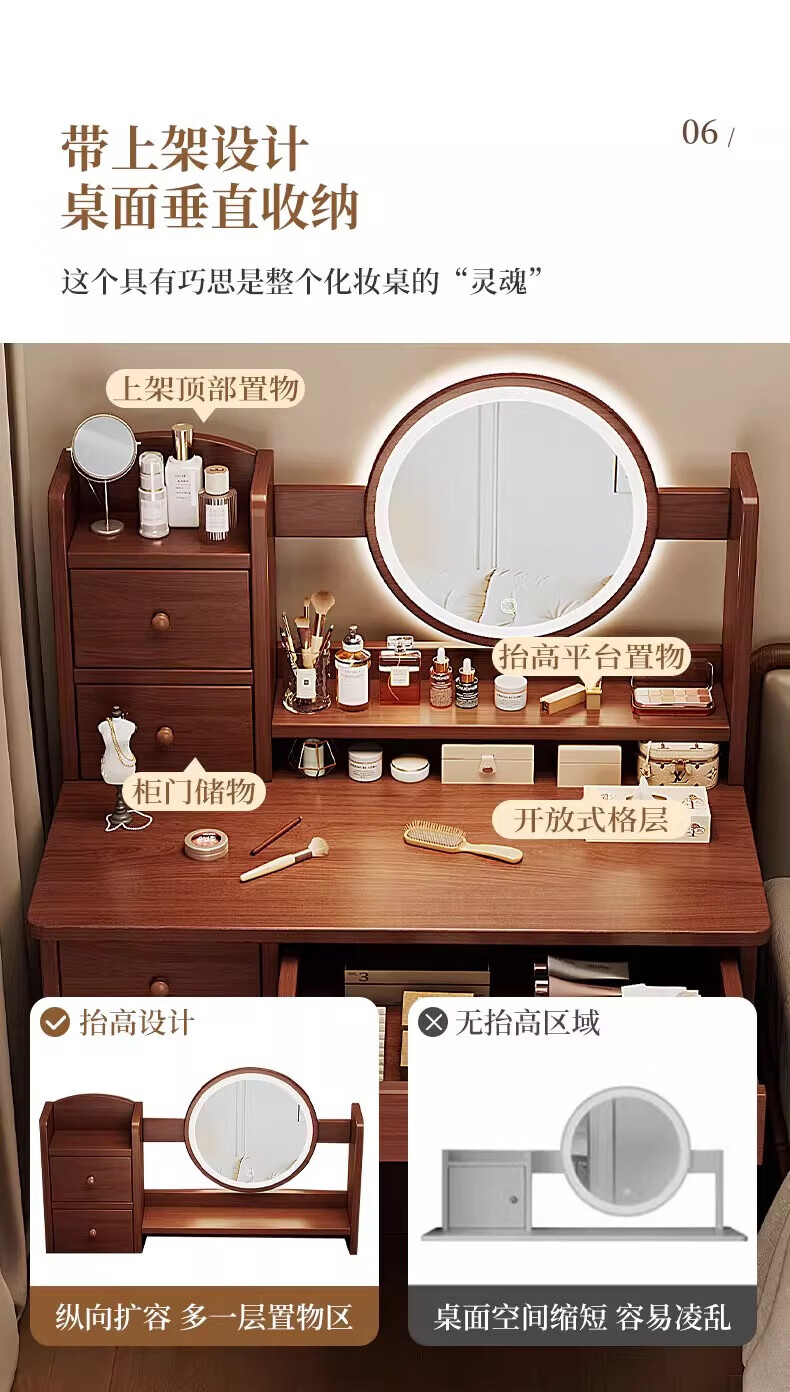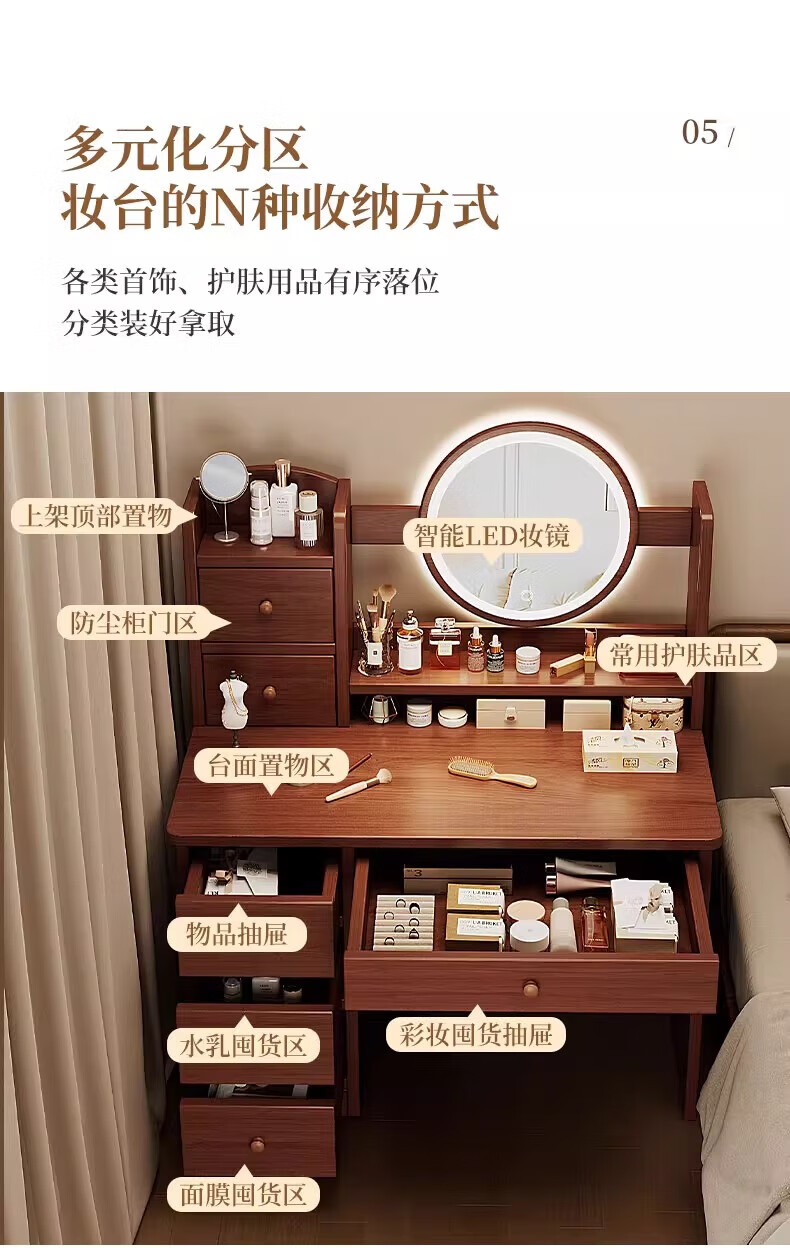 左度实木梳妆台卧室现代简约2025新款小户型斗柜一体轻奢高级感化妆桌 力荐【两抽三门+LED灯】深胡桃色80cm 【加厚实木】梳妆台