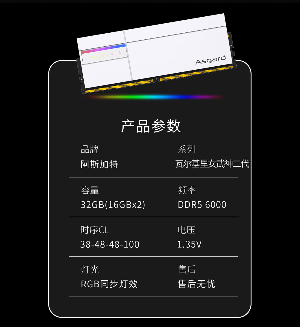 阿斯加特(Asgard)32GB(16GBx2) DDR5 6000 台式机内存条 女武神·瓦尔基里II代 RGB灯条 三星颗粒 CL38 极地白