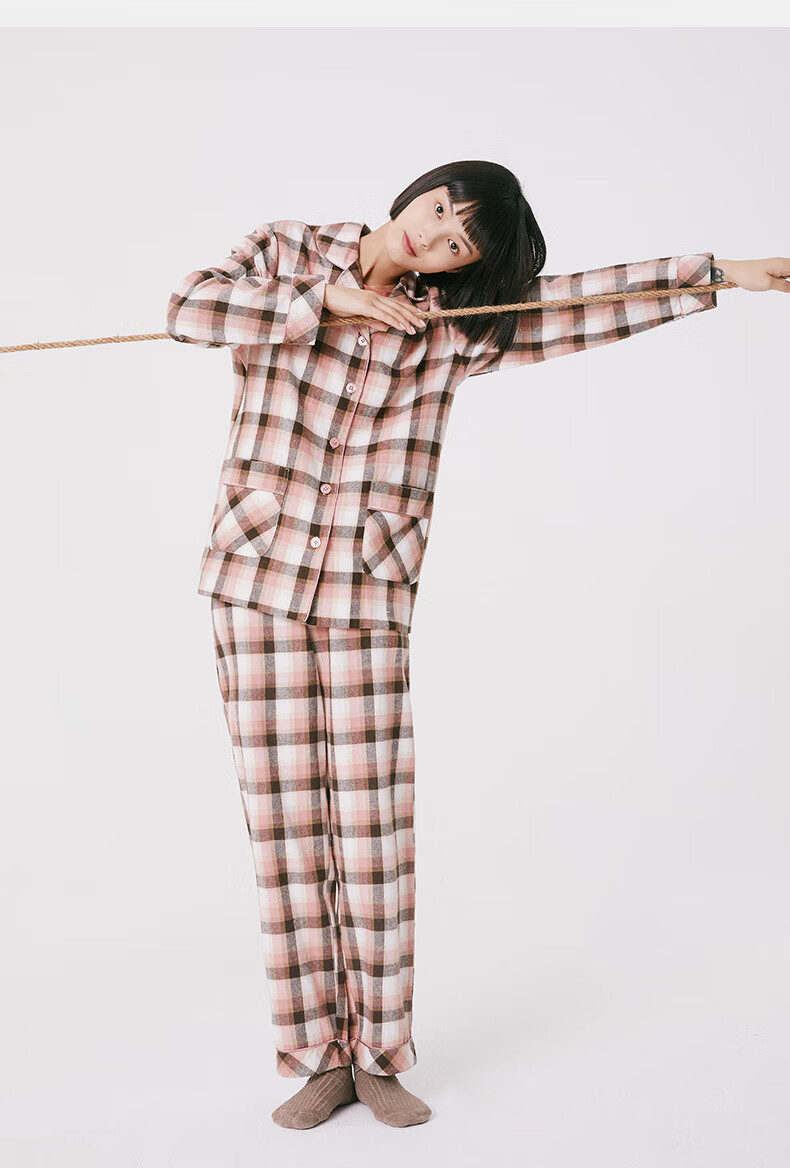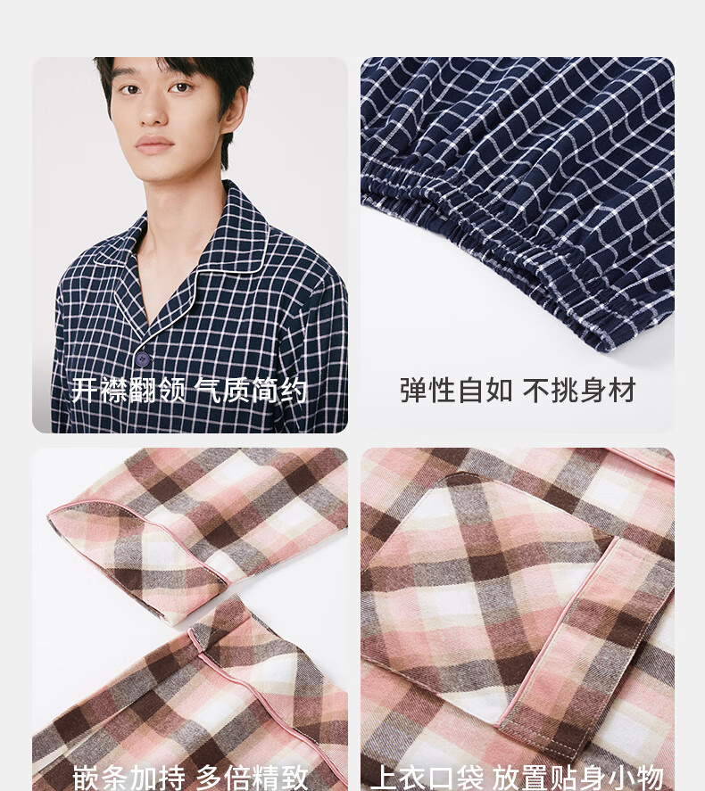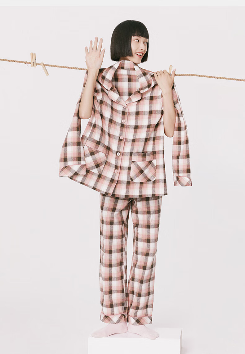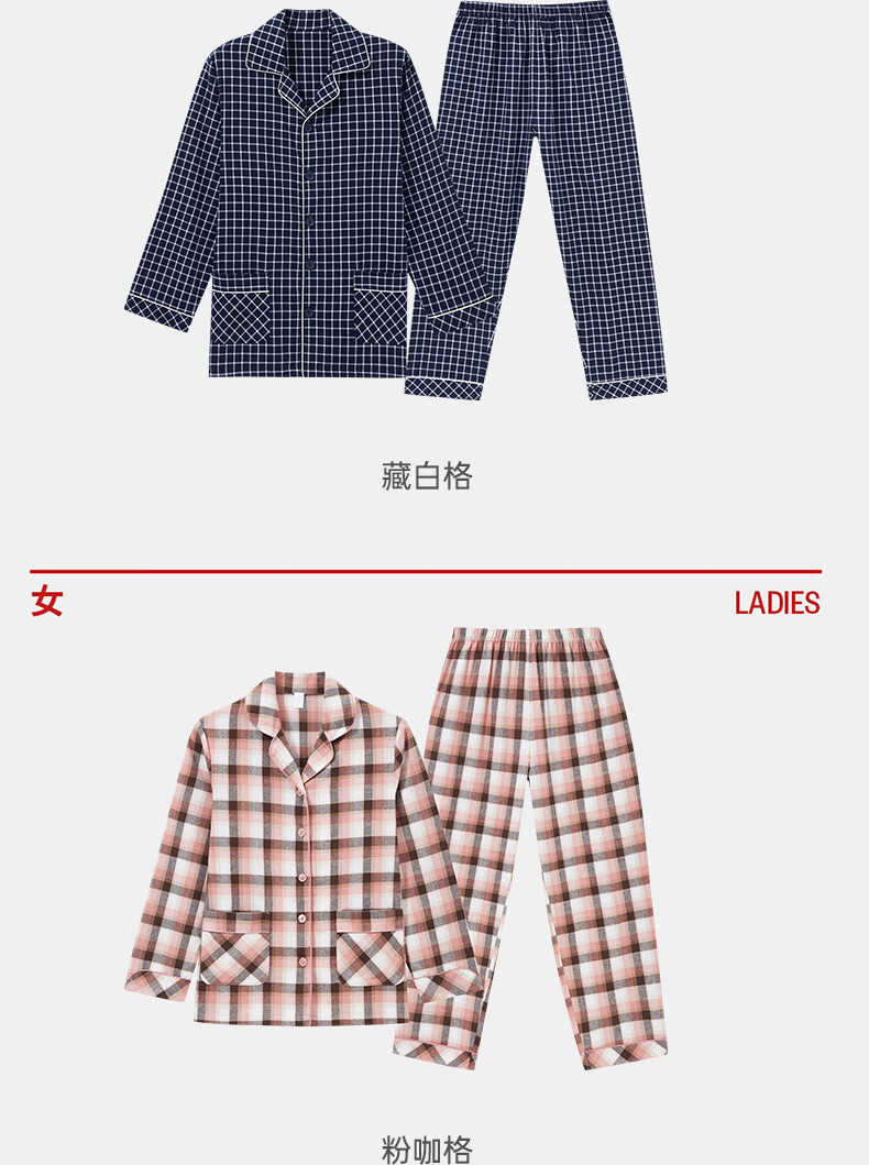 三枪【纯棉绒布】睡衣男翻领舒适开襟经典格纹情侣家居套装