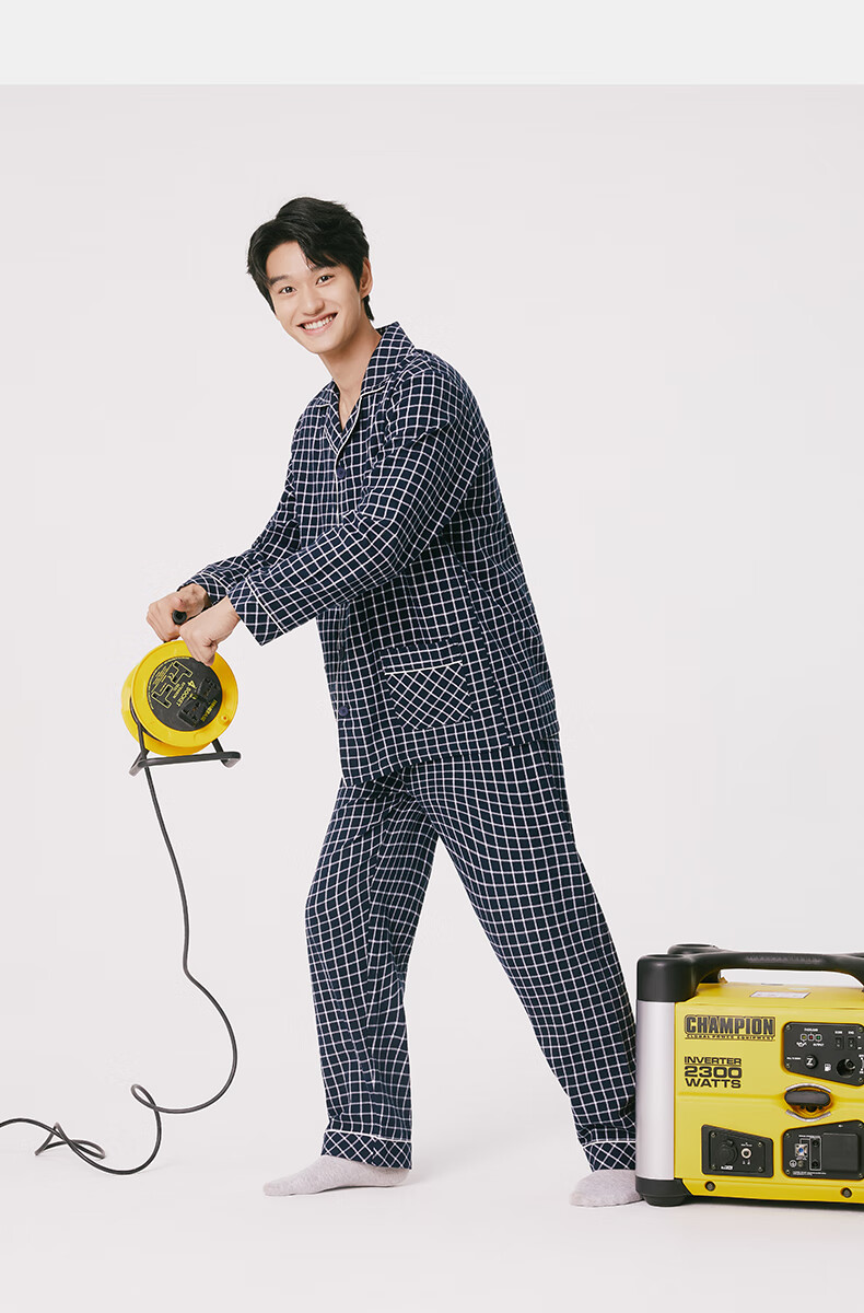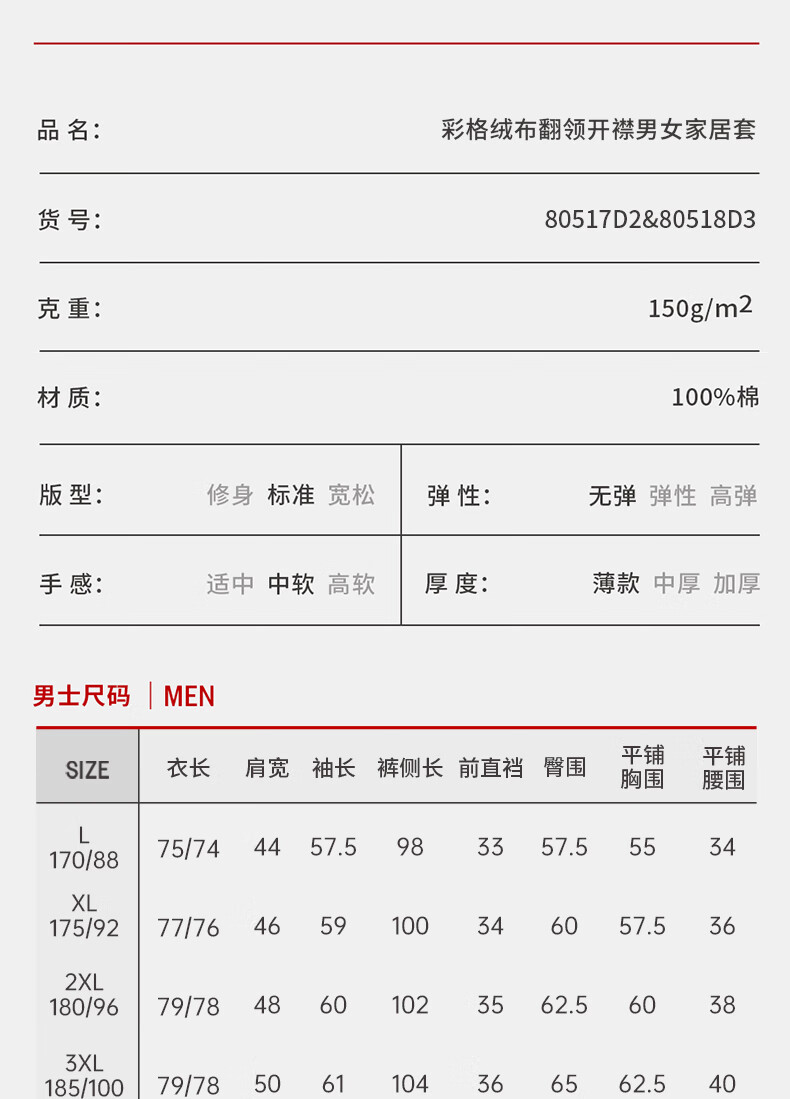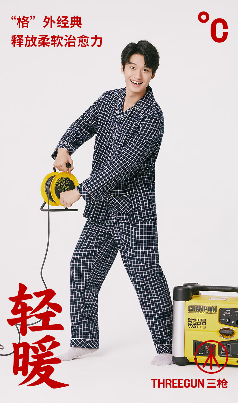 三枪【纯棉绒布】睡衣男翻领舒适开襟经典格纹情侣家居套装