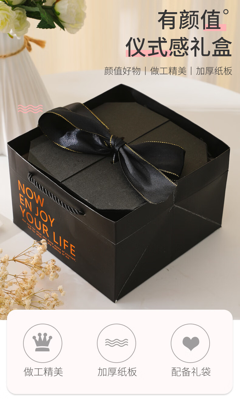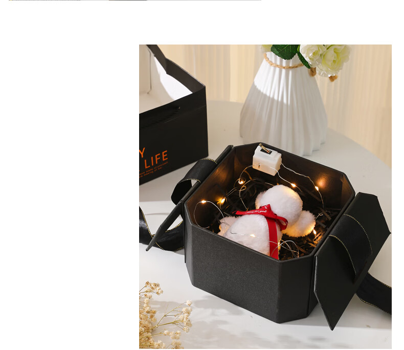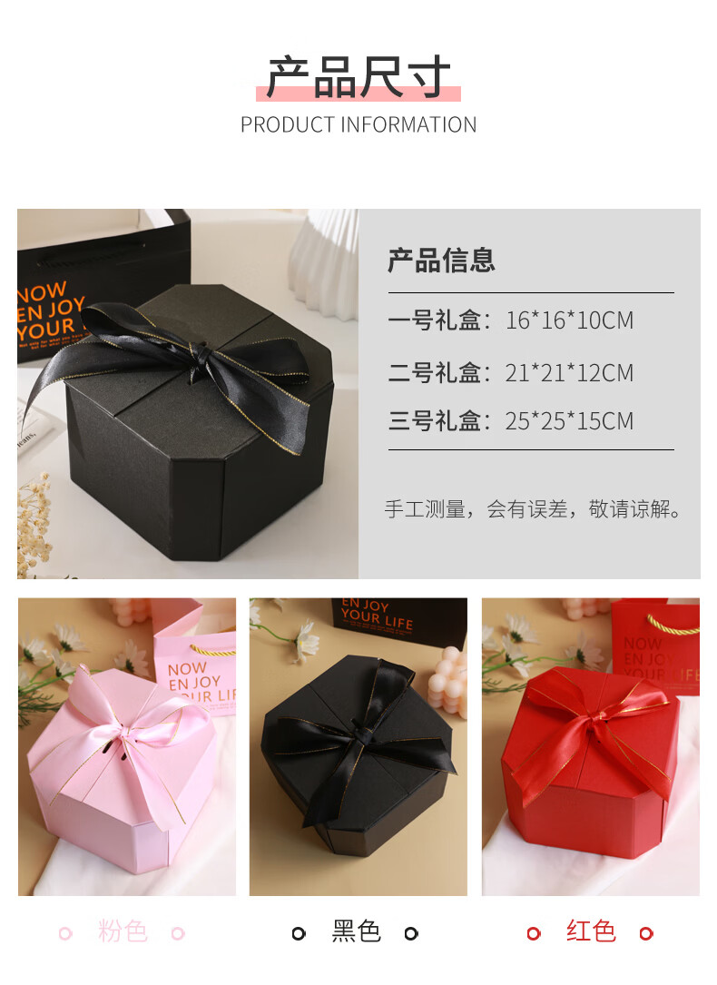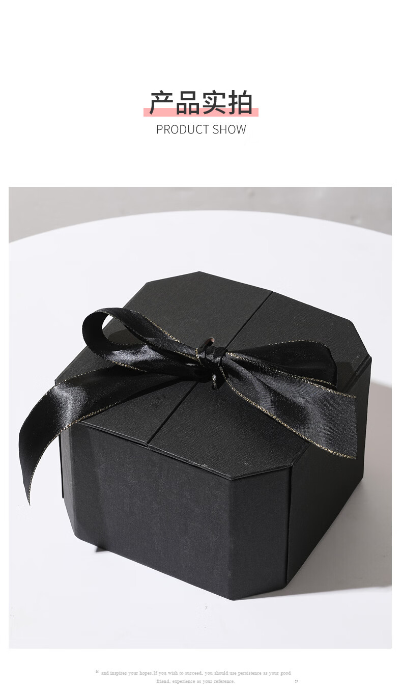 黑色八角礼盒空盒子包装盒生日精致礼物盒高级感情人节伴手礼品盒 长21*宽21*高12cm 粉色礼盒+礼袋+拉菲草+自动灯+许愿兔