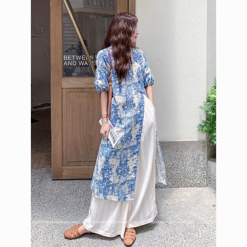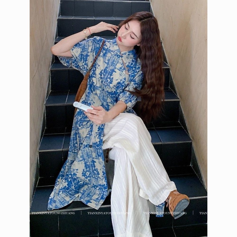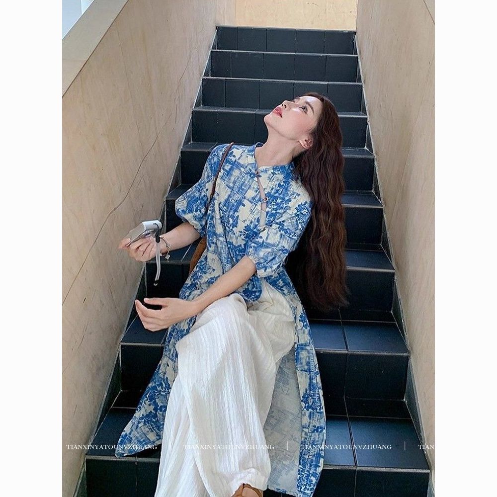 新中式国风女装蓝色印染斜襟罩衫上衣女拼接气质显瘦宽松阔腿裤