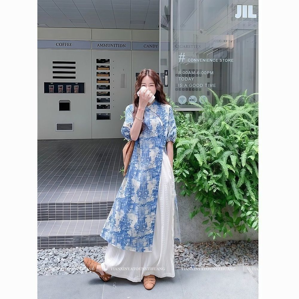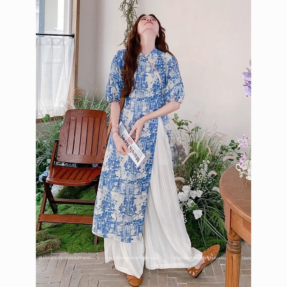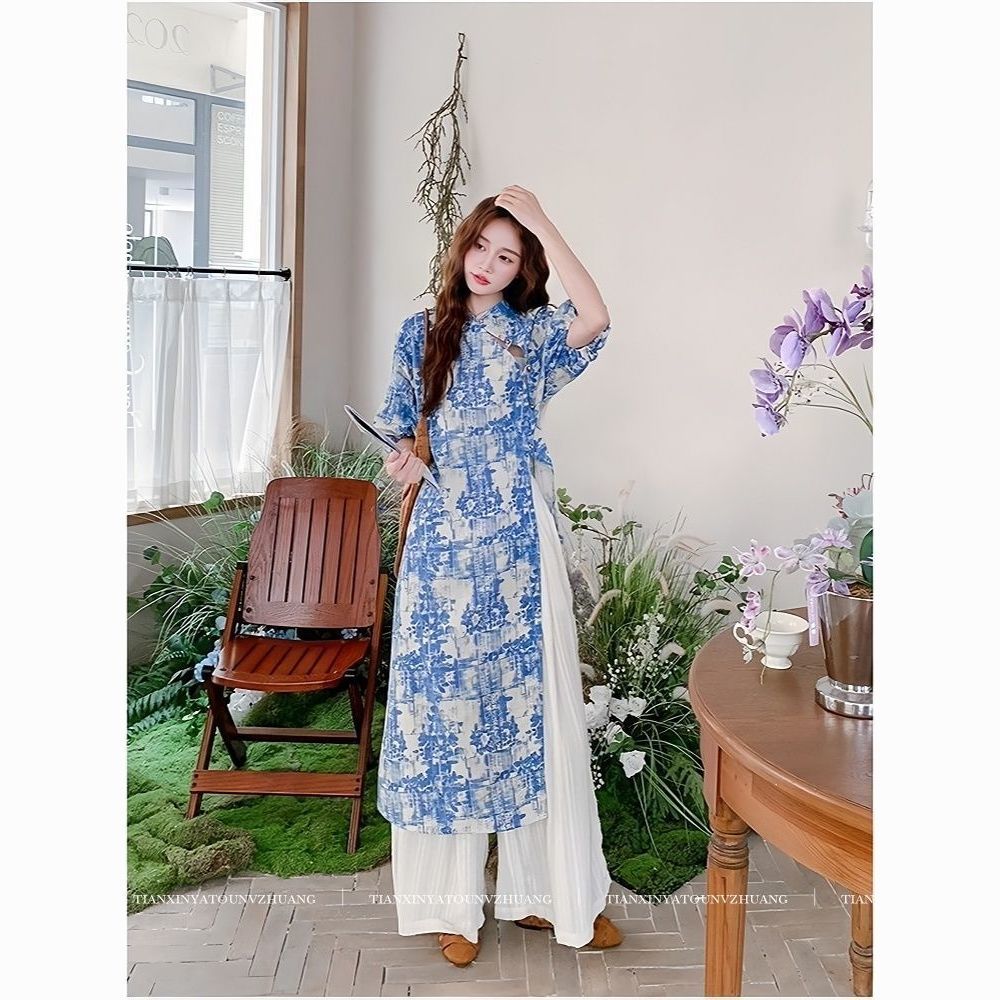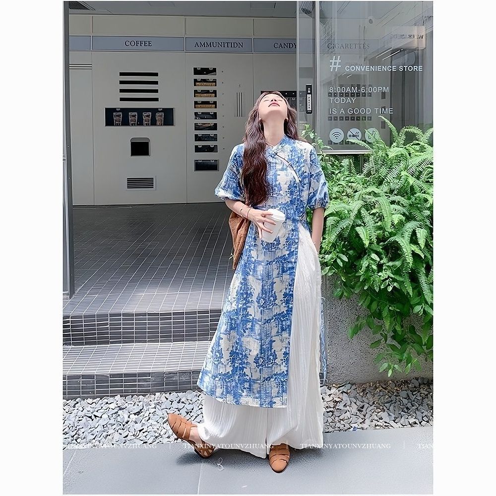 新中式国风女装蓝色印染斜襟罩衫上衣女拼接气质显瘦宽松阔腿裤