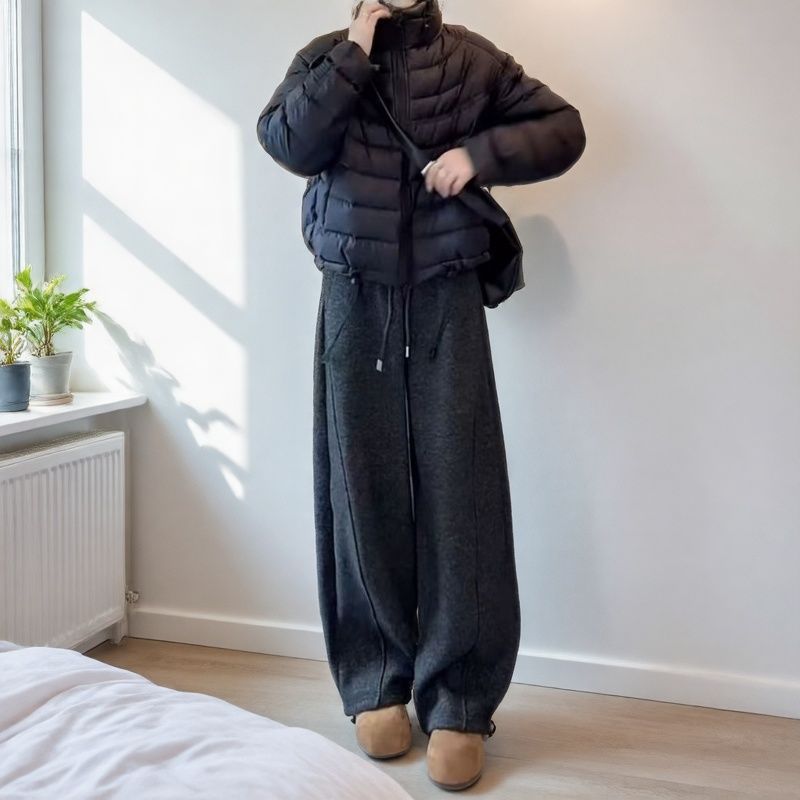 灰色加绒弯刀休闲裤女2025年冬季新款小个子大码显瘦宽松阔腿裤