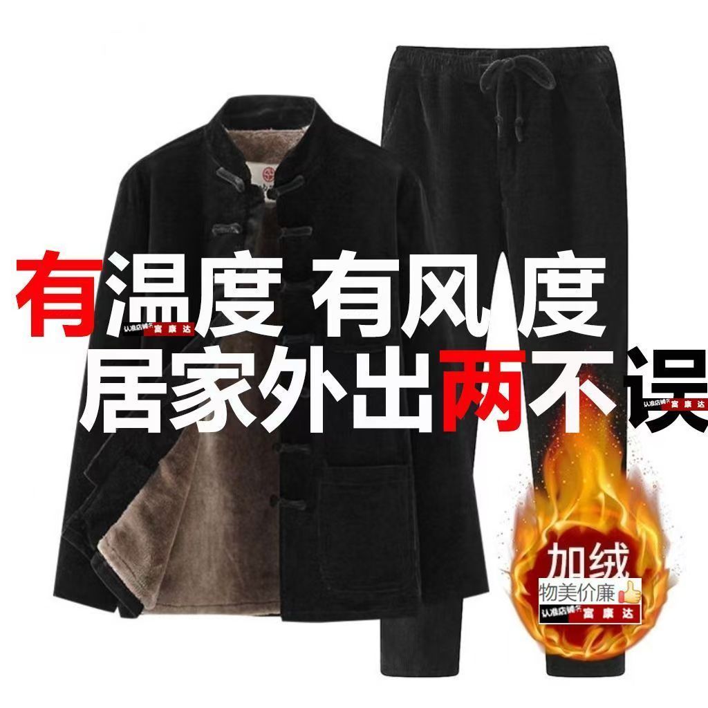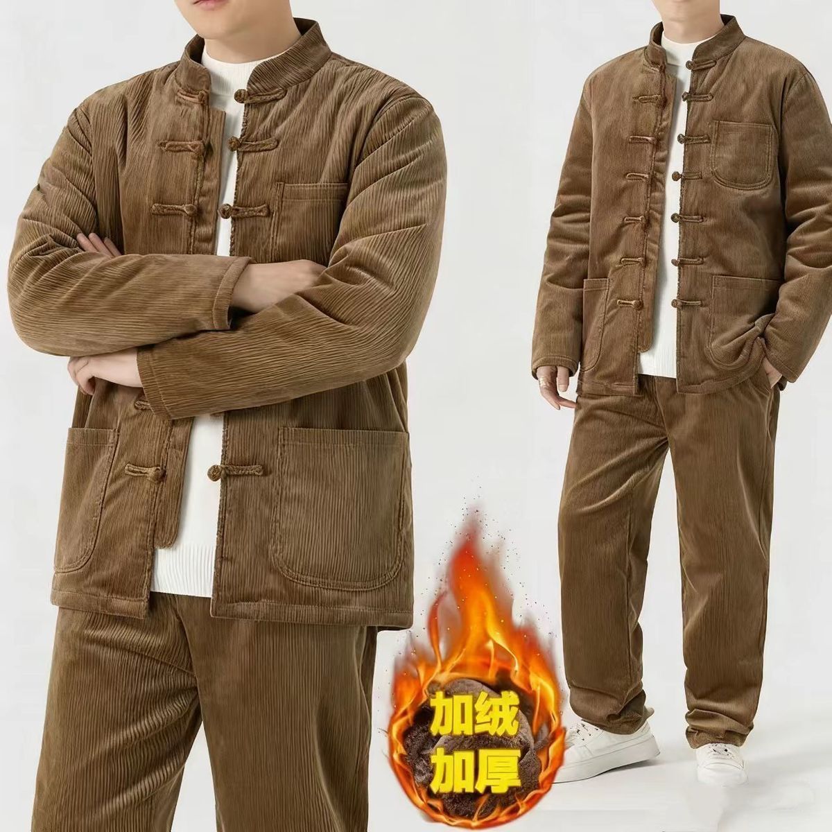 中国风唐装男休闲套装秋冬季民族加绒加厚复古盘扣中式外套两件套