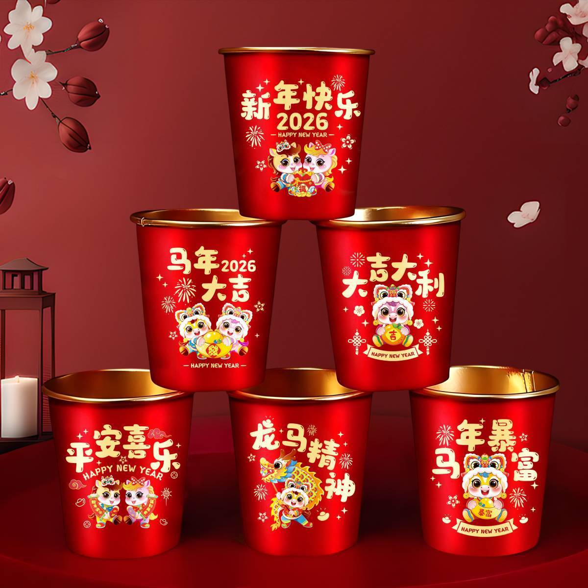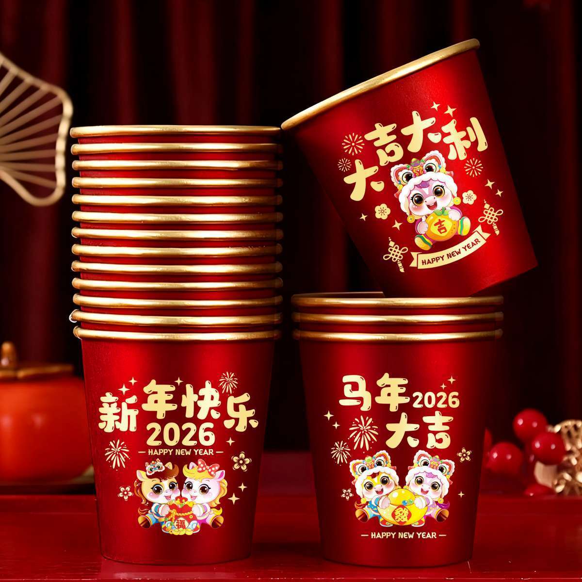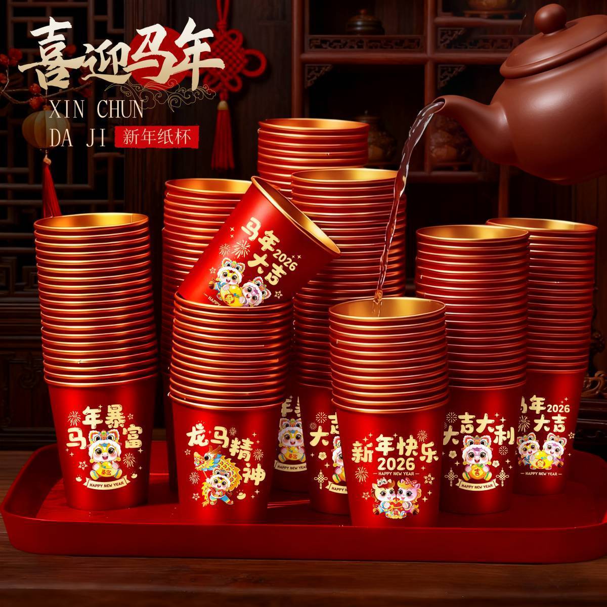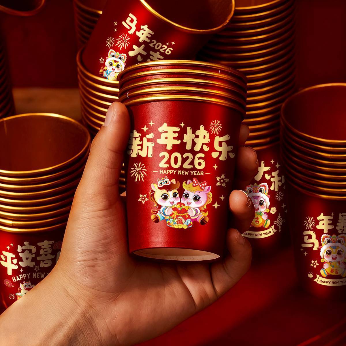 佳适新年一次性金箔杯100个装春节喜杯纸杯2026年马年过年杯子