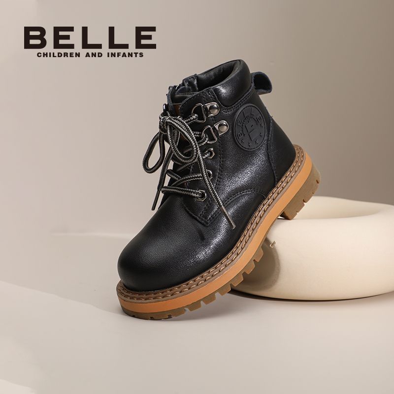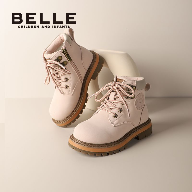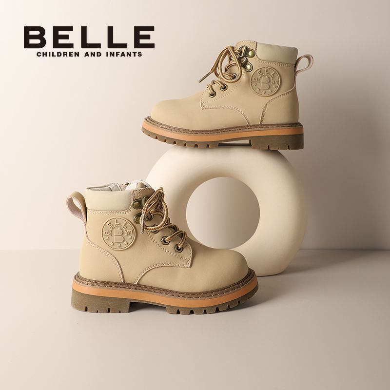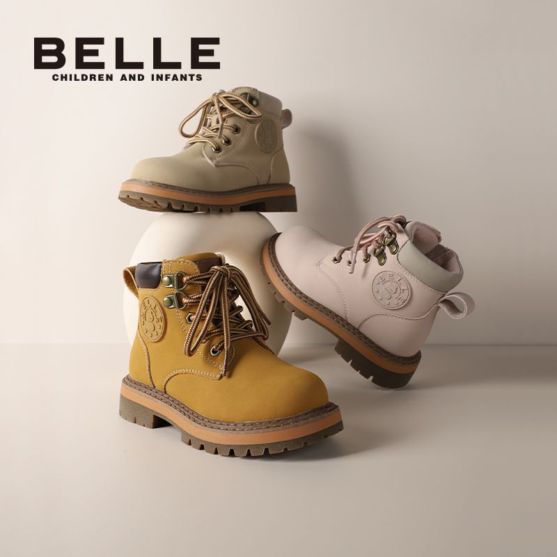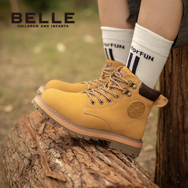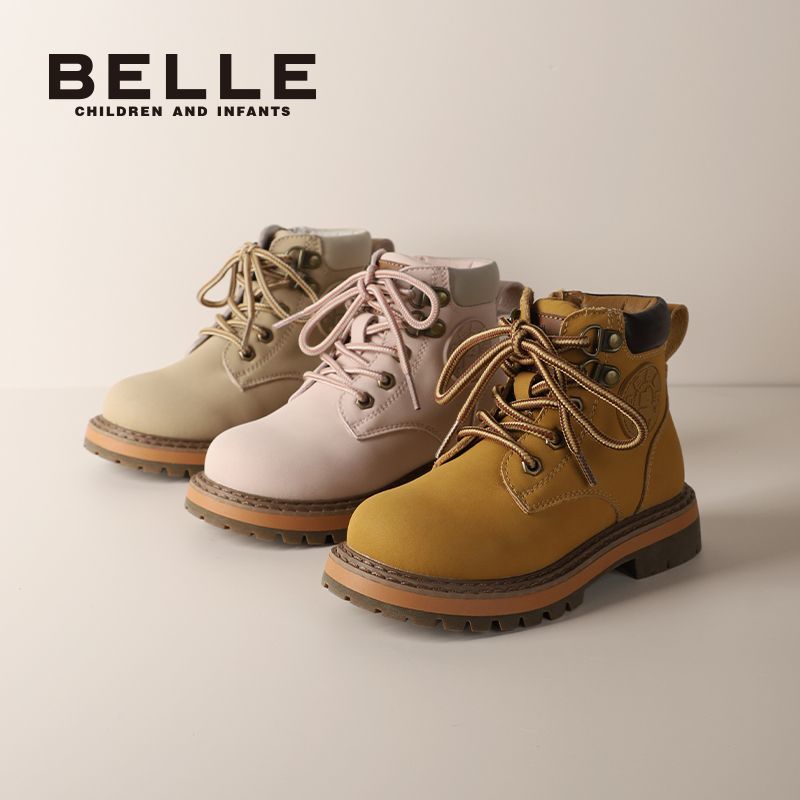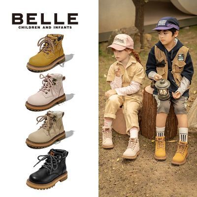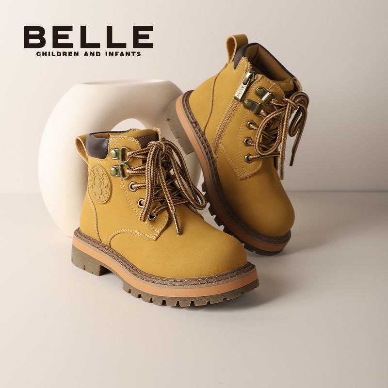 百丽童鞋儿童马丁靴男女童冬季防滑英伦风户外百搭小黄靴加绒皮靴