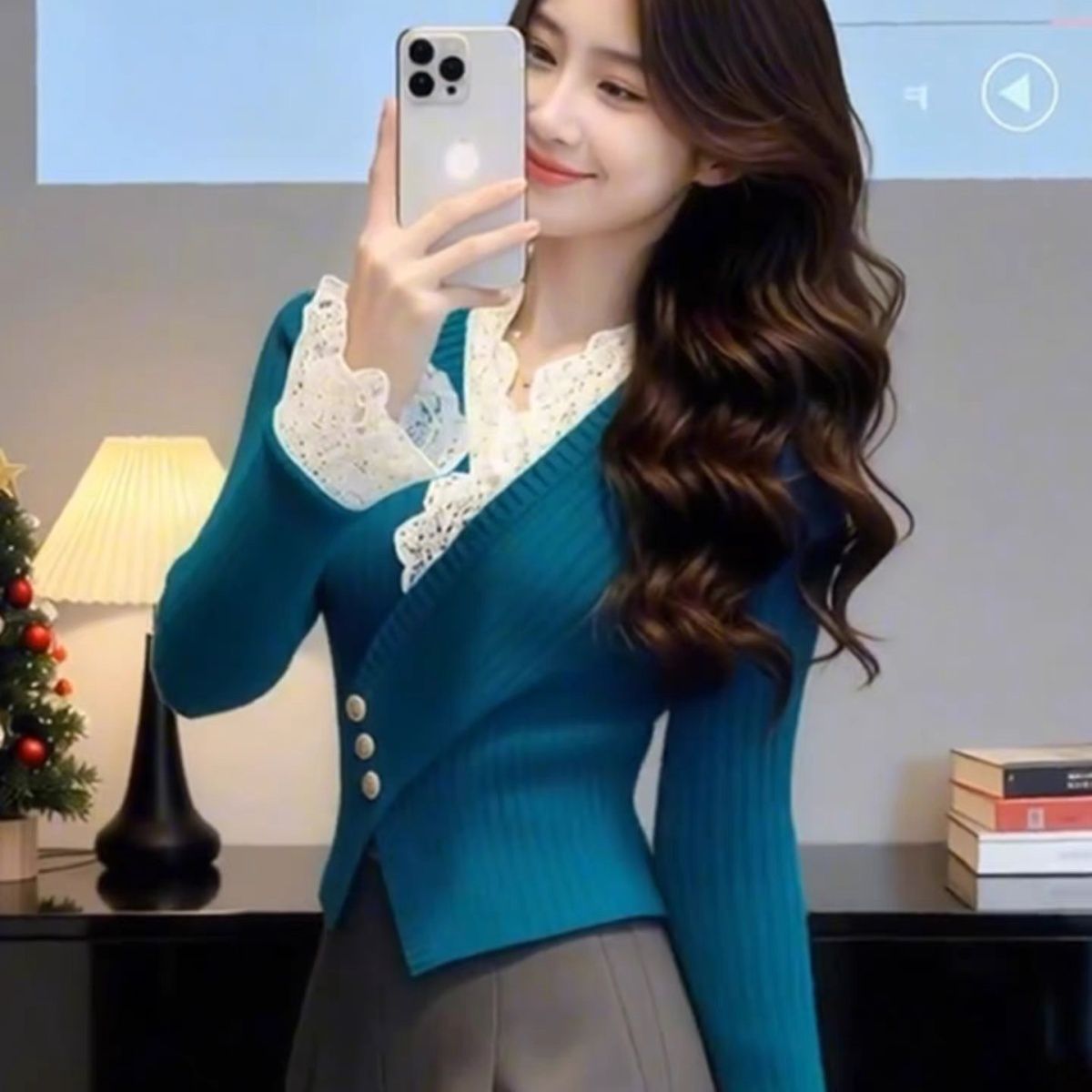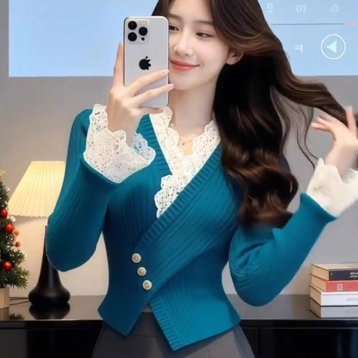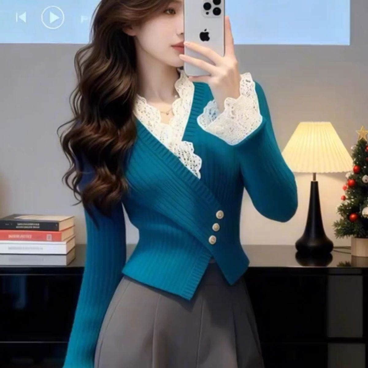 2025冬季小众设计感绝美独特漂亮小香风蕾丝拼接孔雀蓝针织上衣女【7天内发货】