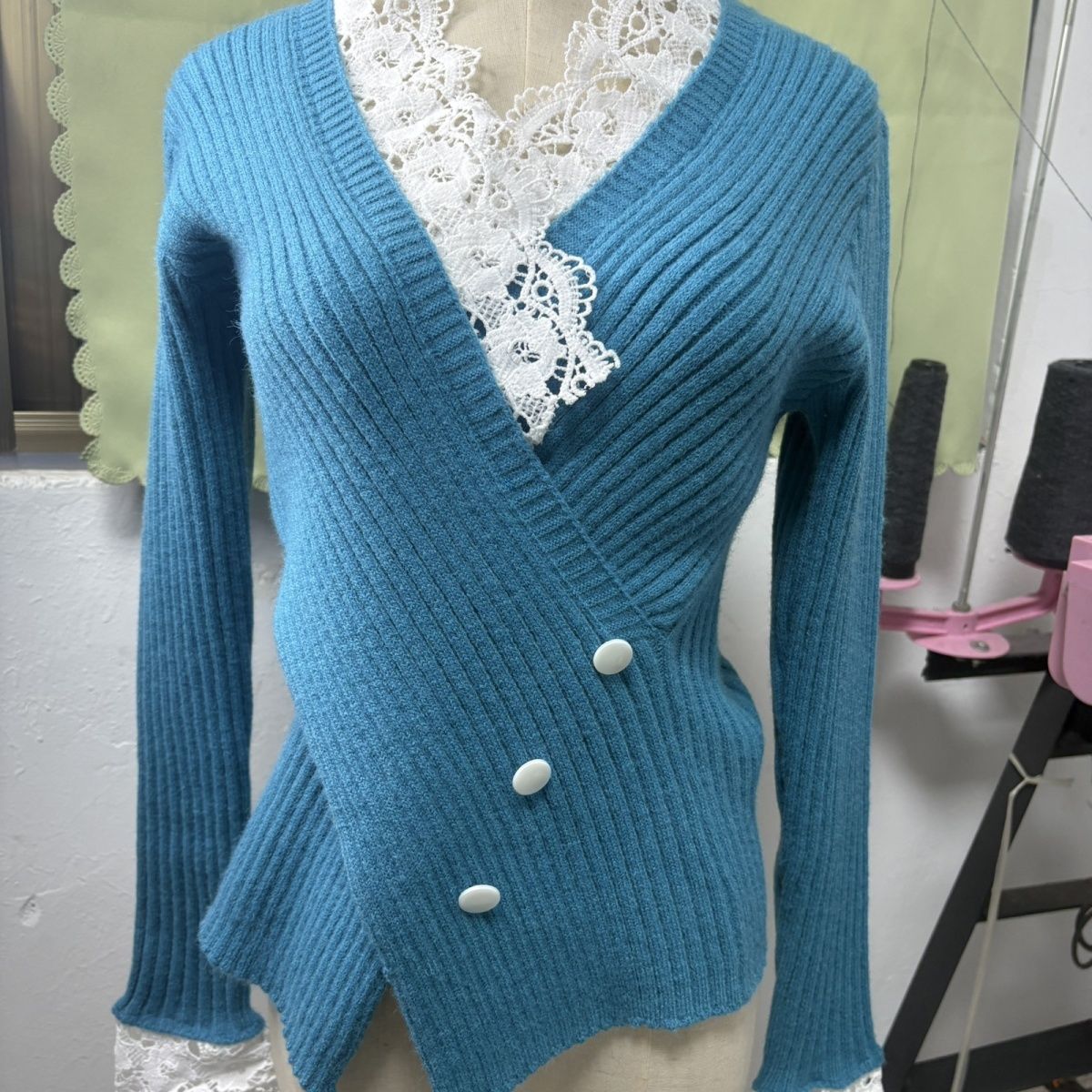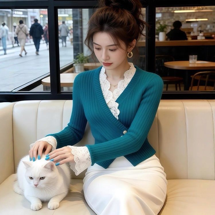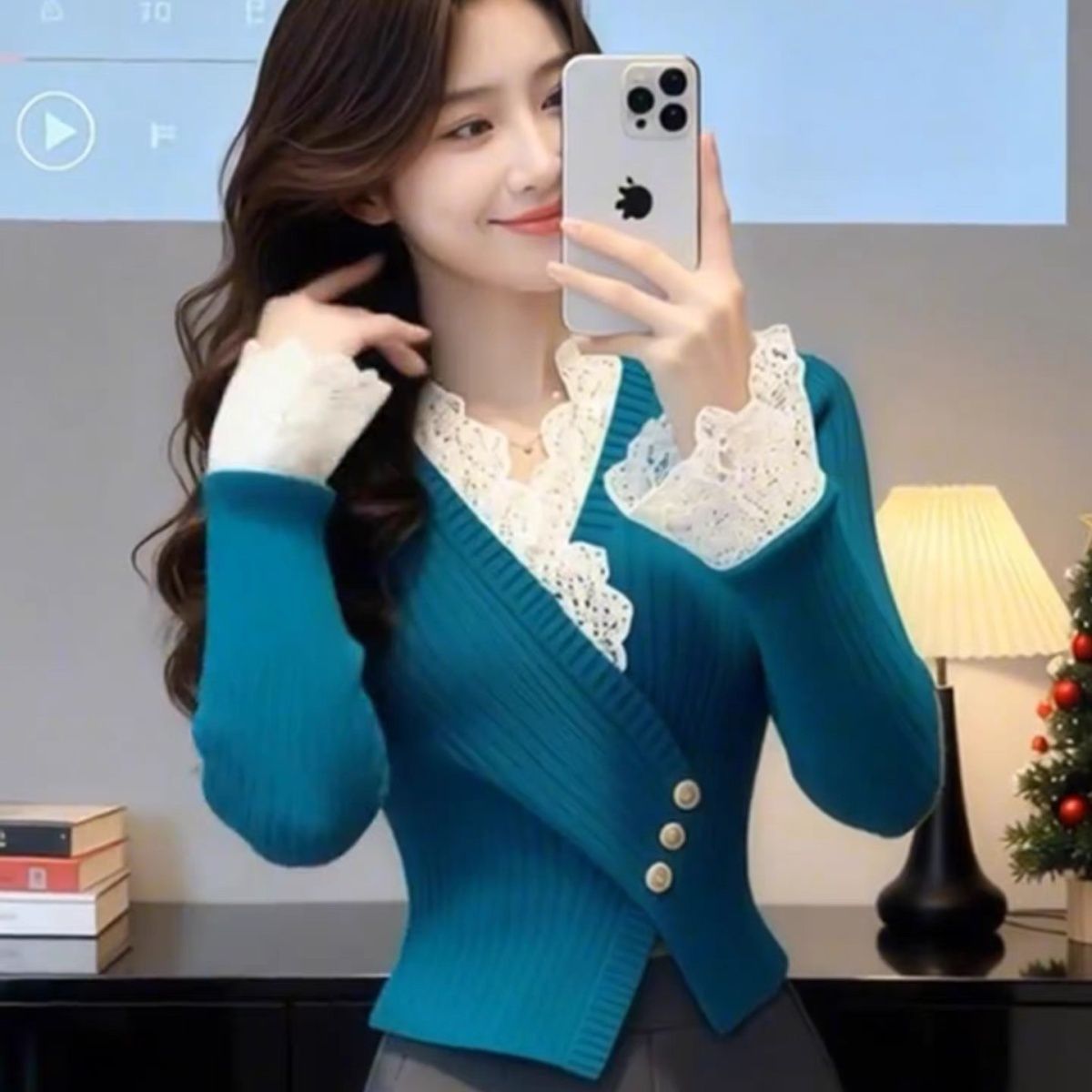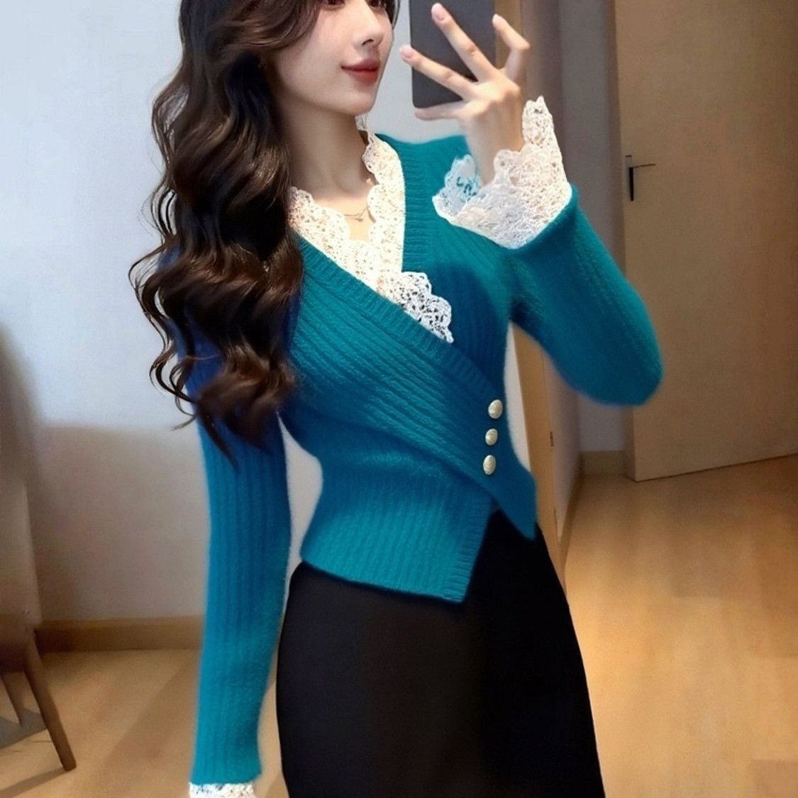 2025冬季小众设计感绝美独特漂亮小香风蕾丝拼接孔雀蓝针织上衣女【7天内发货】